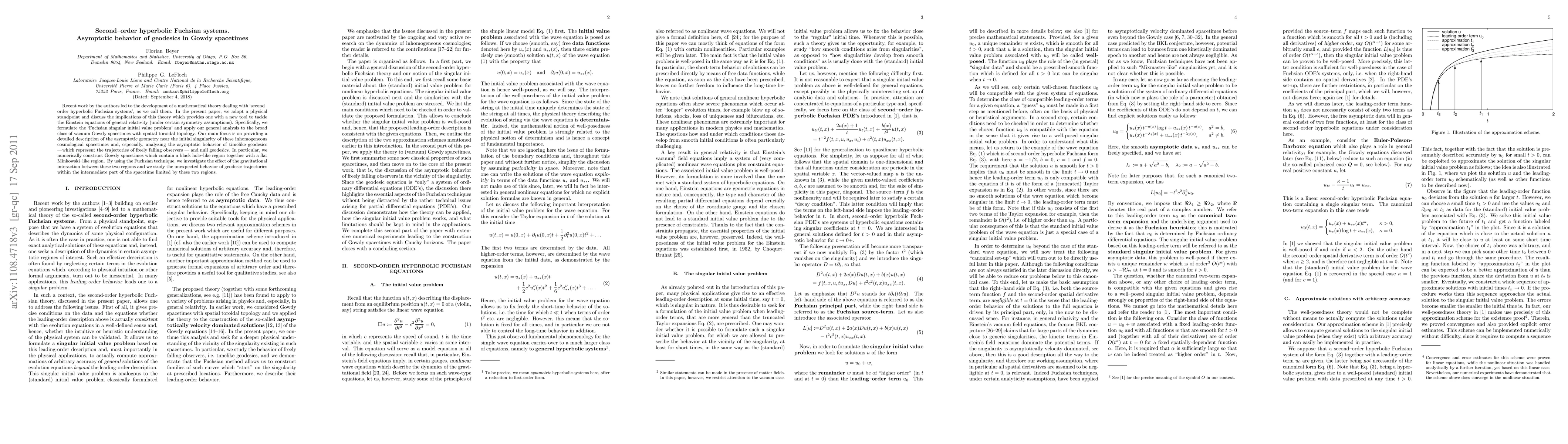 This paper develops a mathematical theory for second-order hyperbolic Fuchsian systems and applies it to analyze the asymptotic behavior of geodesics in Gowdy spacetimes. It focuses on the Fuchsian singular initial value problem and investigates the trajectories of freely falling observers in inhomogeneous cosmological spacetimes, particularly in vacuum Gowdy spacetimes with toroidal topology.