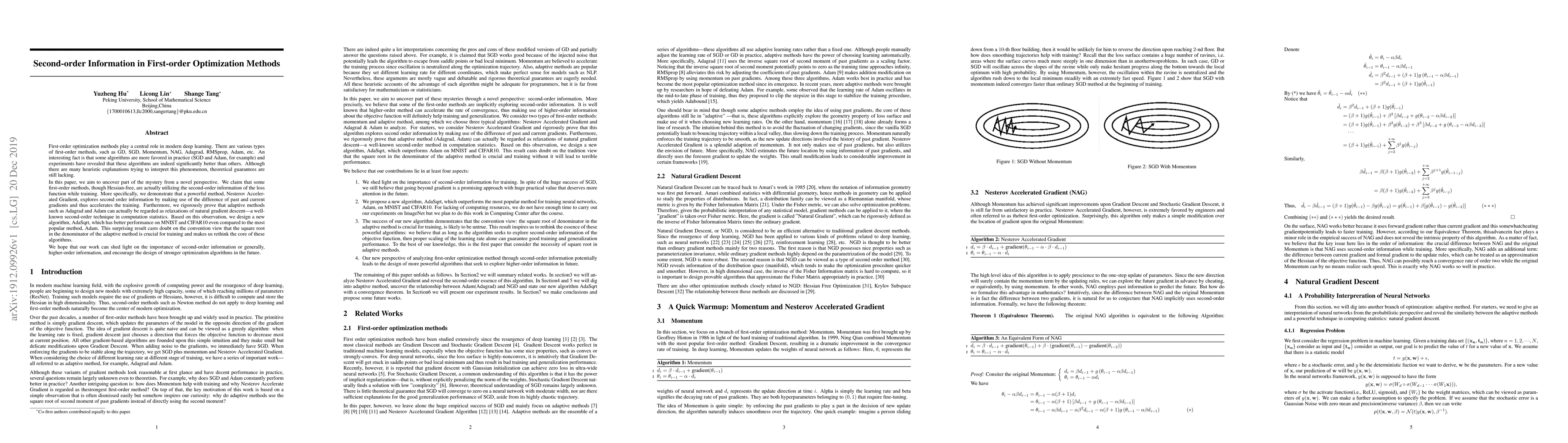 In this paper, we try to uncover the second-order essence of several first-order optimization methods. For Nesterov Accelerated Gradient, we rigorously prove that the algorithm makes use of the difference between past and current gradients, thus approximates the Hessian and accelerates the training. For adaptive methods, we related Adam and Adagrad to a powerful technique in computation statistics---Natural Gradient Descent. These adaptive methods can in fact be treated as relaxations of NGD with only a slight difference lying in the square root of the denominator in the update rules. Skeptical about the effect of such difference, we design a new algorithm---AdaSqrt, which removes the square root in the denominator and scales the learning rate by sqrt(T). Surprisingly, our new algorithm is comparable to various first-order methods(such as SGD and Adam) on MNIST and even beats Adam on CIFAR-10! This phenomenon casts doubt on the convention view that the square root is crucial and training without it will lead to terrible performance. As far as we have concerned, so long as the algorithm tries to explore second or even higher information of the loss surface, then proper scaling of the learning rate alone will guarantee fast training and good generalization performance. To the best of our knowledge, this is the first paper that seriously considers the necessity of square root among all adaptive methods. We believe that our work can shed light on the importance of higher-order information and inspire the design of more powerful algorithms in the future.
