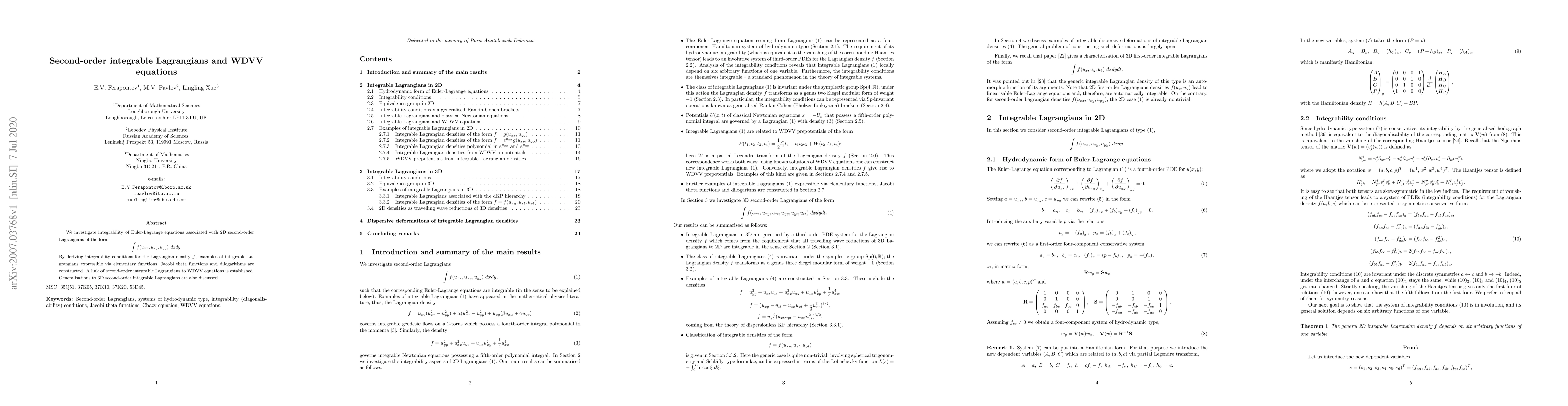 This paper explores the integrability of Euler-Lagrange equations from 2D second-order Lagrangians, deriving conditions for the Lagrangian density $f$ and constructing examples using elementary functions, Jacobi theta functions, and dilogarithms. It establishes a connection between these Lagrangians and WDVV equations, and discusses potential generalizations to 3D.