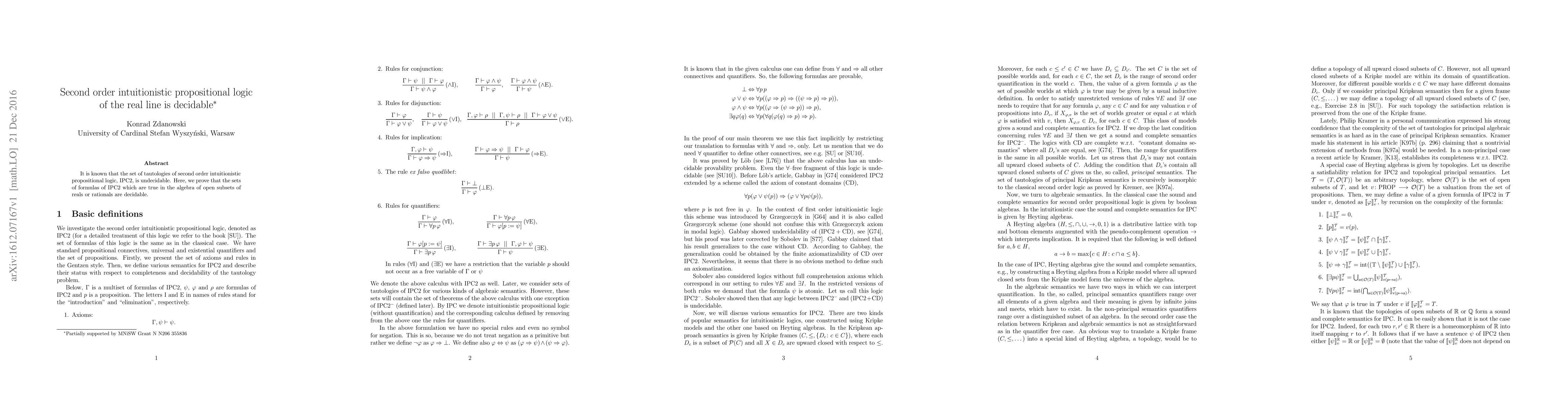 This paper proves that the second order intuitionistic propositional logic ($\mathrm{IPC} 2$) restricted to the algebra of open subsets of reals or rationals is decidable, contrasting with the general undecidability of $\mathrm{IPC} 2$.