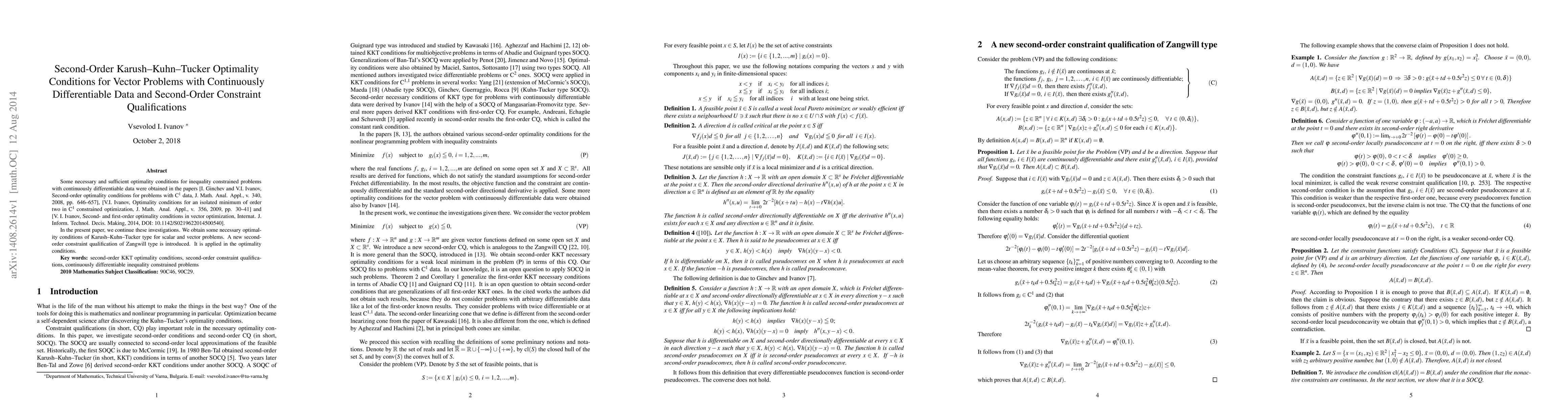 Some necessary and sufficient optimality conditions for inequality constrained problems with continuously differentiable data were obtained in the papers [I. Ginchev and V.I. Ivanov, Second-order optimality conditions for problems with C$\sp{1}$ data, J. Math. Anal. Appl., v. 340, 2008, pp. 646--657], [V.I. Ivanov, Optimality conditions for an isolated minimum of order two in C$\sp{1}$ constrained optimization, J. Math. Anal. Appl., v. 356, 2009, pp. 30--41] and [V. I. Ivanov, Second- and first-order optimality conditions in vector optimization, Internat. J. Inform. Technol. Decis. Making, 2014, DOI: 10.1142/S0219622014500540]. In the present paper, we continue these investigations. We obtain some necessary optimality conditions of Karush--Kuhn--Tucker type for scalar and vector problems. A new second-order constraint qualification of Zangwill type is introduced. It is applied in the optimality conditions.