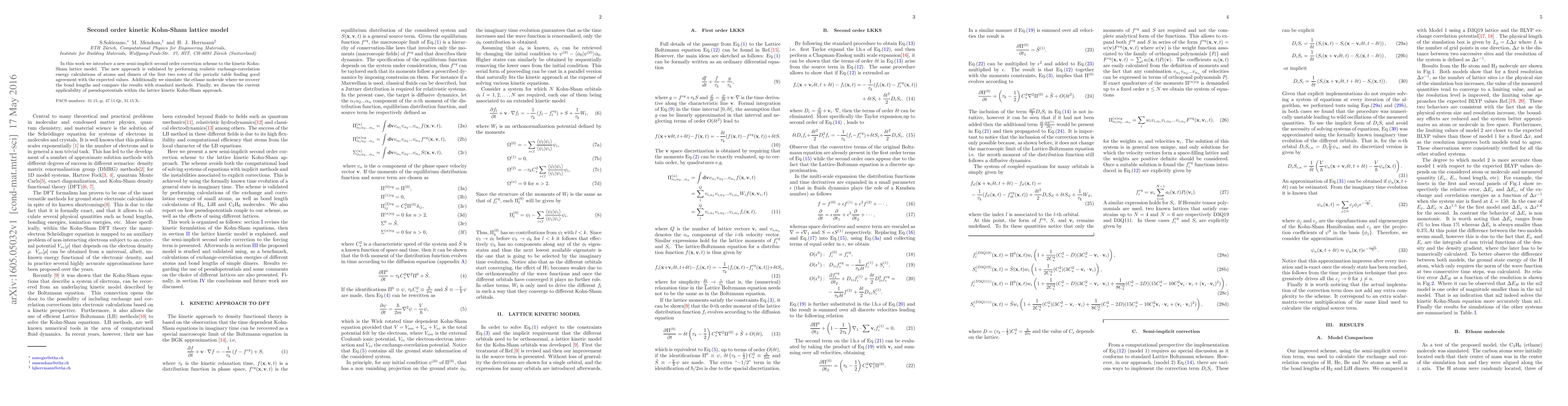 In this work we introduce a new semi-implicit second order correction scheme to the kinetic Kohn-Sham lattice model. The new approach is validated by performing realistic exchange-correlation energy calculations of atoms and dimers of the first two rows of the periodic table finding good agreement with the expected values. Additionally we simulate the ethane molecule where we recover the bond lengths and compare the results with standard methods. Finally, we discuss the current applicability of pseudopotentials within the lattice kinetic Kohn-Sham approach.