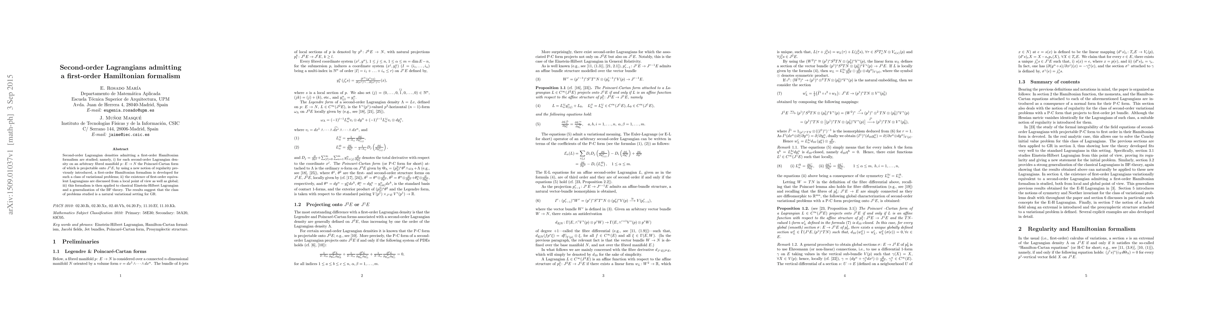 Second-order Lagrangian densities admitting a first-order Hamiltonian formalism are studied; namely, i) for each second-order Lagrangian density on an arbitrary fibred manifold $p\colon E\to N$ the Poincar\'e-Cartan form of which is projectable onto $J^1E$, by using a new notion of regularity previously introduced, a first-order Hamiltonian formalism is developed for such a class of variational problems; ii) the existence of first-order equivalent Lagrangians are discussed from a local point of view as well as global; iii) this formalism is then applied to classical Einstein-Hilbert Lagrangian and a generalization of the BF theory. The results suggest that the class of problems studied is a natural variational setting for GR.