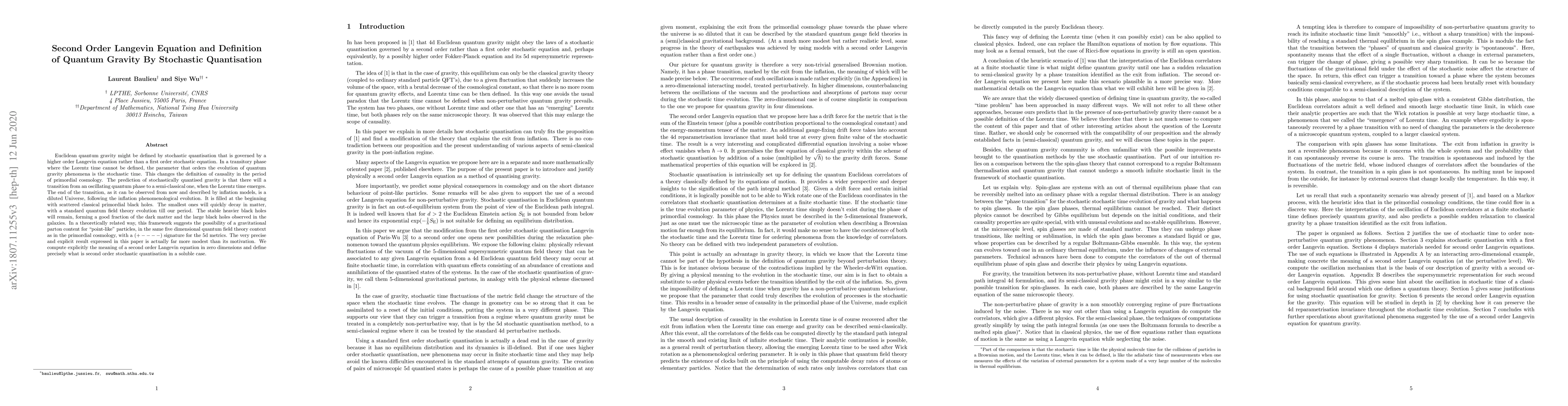 Euclidean quantum gravity might be defined by stochastic quantisation that is governed by a higher order Langevin equation rather than a first order stochastic equation. In a transitory phase where the Lorentz time cannot be defined, the parameter that orders the evolution of quantum gravity phenomena is the stochastic time. This changes the definition of causality in the period of primordial cosmology. The prediction of stochastically quantised gravity is that there will a transition from an oscillating quantum phase to a semi-classical one, when the Lorentz time emerges. The end of the transition, as it can be observed from now and described by inflation models, is a diluted Universe, following the inflation phenomenological evolution. It is filled at the beginning with scattered classical primordial black holes. The smallest ones will quickly decay in matter, with a standard quantum field theory evolution till our period. The stable heavier black holes will remain, forming a good fraction of the dark matter and the large black holes observed in the galaxies. In a theoretically related way, this framework suggests the possibility of a gravitational parton content for "point-like" particles, in the same five dimensional quantum field theory context as in the primordial cosmology, with a (+----) signature for the 5d metrics. The very precise and explicit result expressed in this paper is actually far more modest than its motivation. We compute explicitly the meaning of a second order Langevin equation in zero dimensions and define precisely what is second order stochastic quantisation in a soluble case.