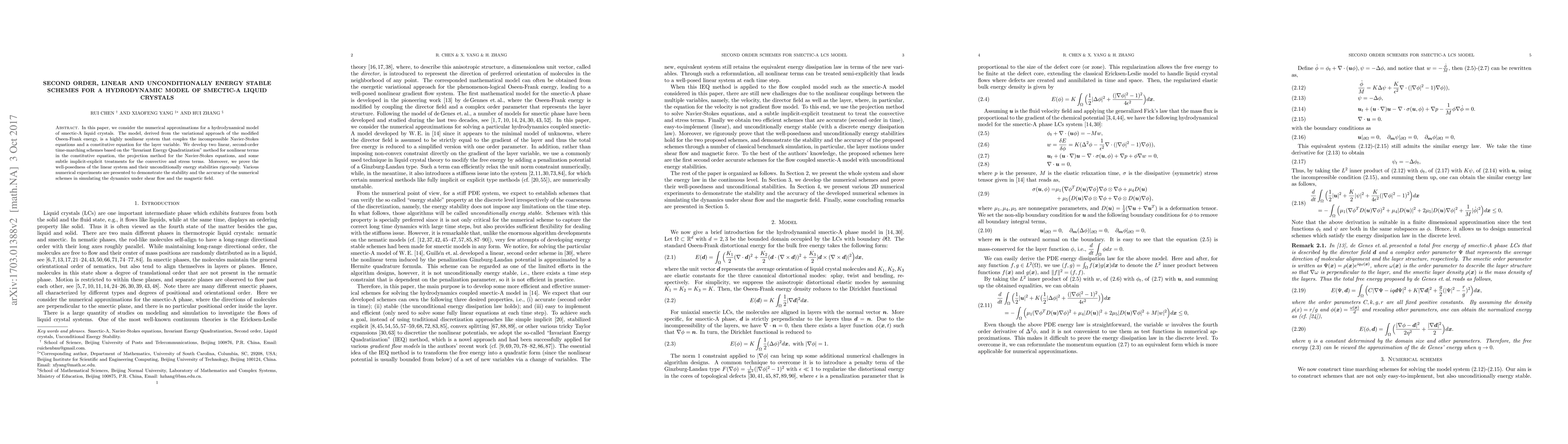 In this paper, we consider the numerical approximations for a hydrodynamical model of smectic-A liquid crystals. The model, derived from the variational approach of the modified Oseen-Frank energy, is a highly nonlinear system that couples the incompressible Navier-Stokes equations and a constitutive equation for the layer variable. We develop two linear, second-order time-marching schemes based on the "Invariant Energy Quadratization" method for nonlinear terms in the constitutive equation, the projection method for the Navier-Stokes equations, and some subtle implicit-explicit treatments for the convective and stress terms. Moreover, we prove the well-posedness of the linear system and their unconditionally energy stabilities rigorously. Various numerical experiments are presented to demonstrate the stability and the accuracy of the numerical schemes in simulating the dynamics under shear flow and the magnetic field.
