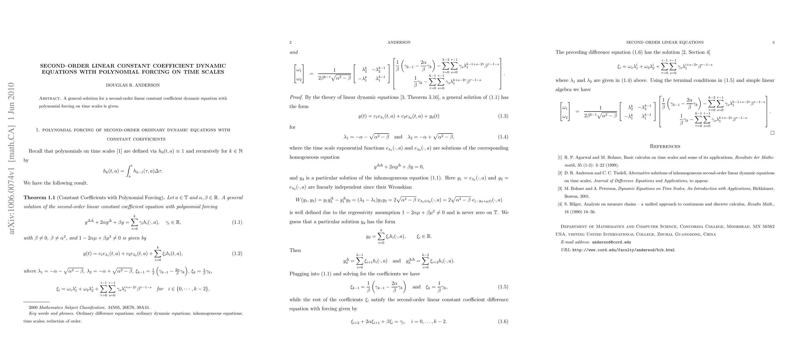 Summary: This paper presents a general solution methodology for second-order linear constant coefficient dynamic equations with polynomial forcing on time scales, extending traditional calculus to discrete, continuous, and hybrid time frameworks. The approach provides a unified framework applicable across various time scales.