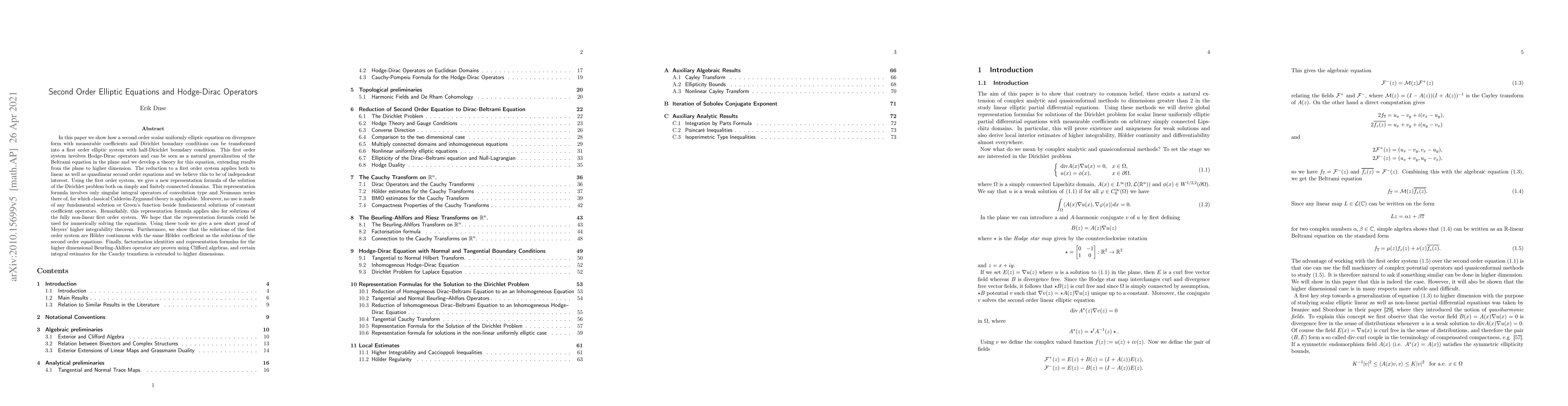 In this paper we show how a second order scalar uniformly elliptic equation on divergence form with measurable coefficients and Dirichlet boundary conditions can be transformed into a first order elliptic system with half-Dirichlet boundary condition. This first order system involves Hodge-Dirac operators and can be seen as a natural generalization of the Beltrami equation in the plane and we develop a theory for this equation, extending results from the plane to higher dimension. The reduction to a first order system applies both to linear as well as quasilinear second order equations and we believe this to be of independent interest. Using the first order system, we give a new representation formula of the solution of the Dirichlet problem both on simply and finitely connected domains. This representation formula involves only singular integral operators of convolution type and Neumann series there of, for which classical Calder\'on-Zygmund theory is applicable. Moreover, no use is made of any fundamental solution or Green's function beside fundamental solutions of constant coefficient operators. Remarkably, this representation formula applies also for solutions of the fully non-linear first order system. We hope that the representation formula could be used for numerically solving the equations. Using these tools we give a new short proof of Meyers' higher integrability theorem. Furthermore, we show that the solutions of the first order system are H\"older continuous with the same H\"older coefficient as the solutions of the second order equations. Finally, factorization identities and representation formulas for the higher dimensional Beurling-Ahlfors operator are proven.