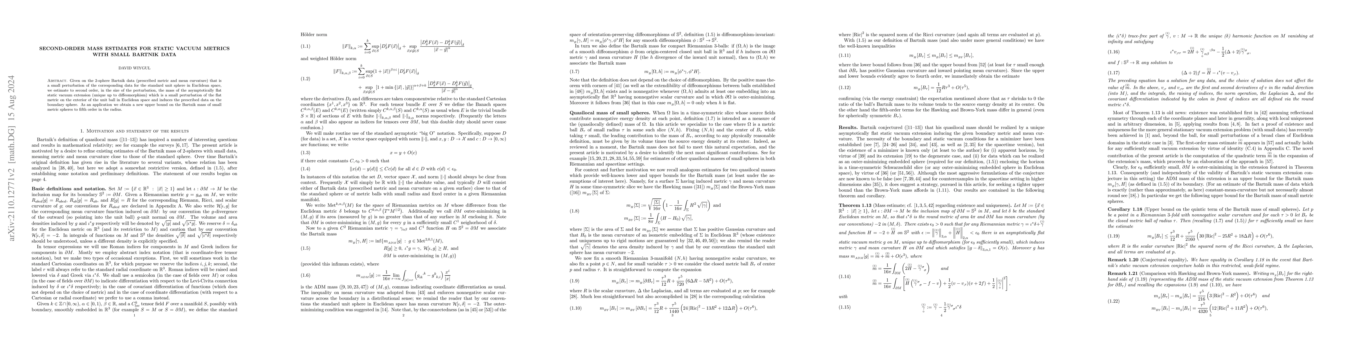 Given on the $2$-sphere Bartnik data (prescribed metric and mean curvature) that is a small perturbation of the corresponding data for the standard unit sphere in Euclidean space, we estimate to second order, in the size of the perturbation, the mass of the asymptotically flat static vacuum extension (unique up to diffeomorphism) which is a small perturbation of the flat metric on the exterior of the unit ball in Euclidean space and induces the prescribed data on the boundary sphere. As an application we obtain a new upper bound on the Bartnik mass of small metric spheres to fifth order in the radius.