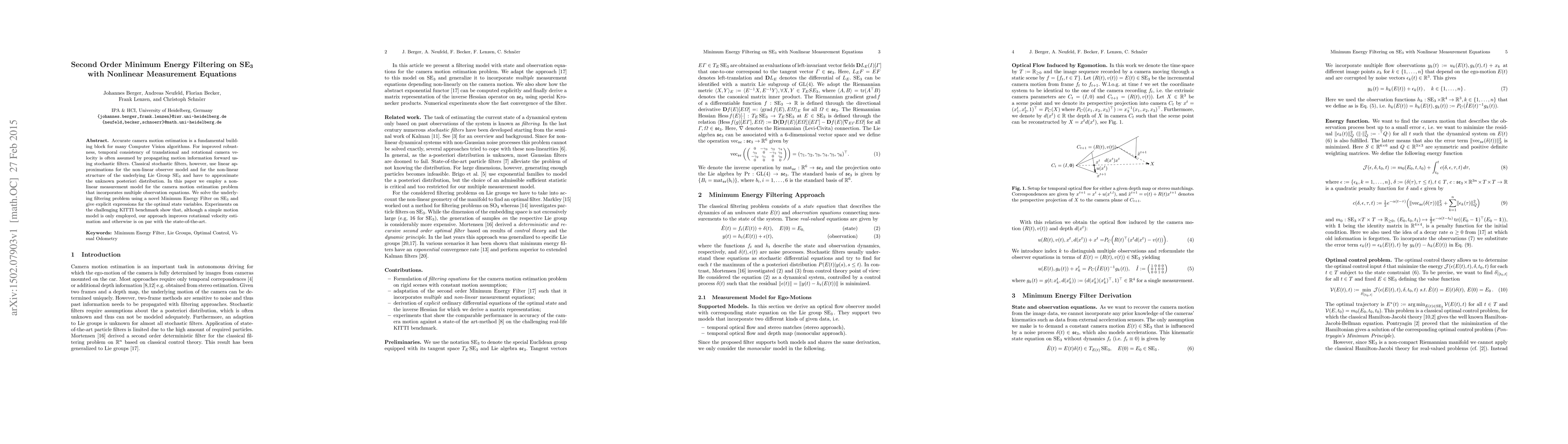 Accurate camera motion estimation is a fundamental building block for many Computer Vision algorithms. For improved robustness, temporal consistency of translational and rotational camera velocity is often assumed by propagating motion information forward using stochastic filters. Classical stochastic filters, however, use linear approximations for the non-linear observer model and for the non-linear structure of the underlying Lie Group $\operatorname{SE}_3$ and have to approximate the unknown posteriori distribution. In this paper we employ a non-linear measurement model for the camera motion estimation problem that incorporates multiple observation equations. We solve the underlying filtering problem using a novel Minimum Energy Filter on $\operatorname{SE}_3$ and give explicit expressions for the optimal state variables. Experiments on the challenging KITTI benchmark show that, although a simple motion model is only employed, our approach improves rotational velocity estimation and otherwise is on par with the state-of-the-art.