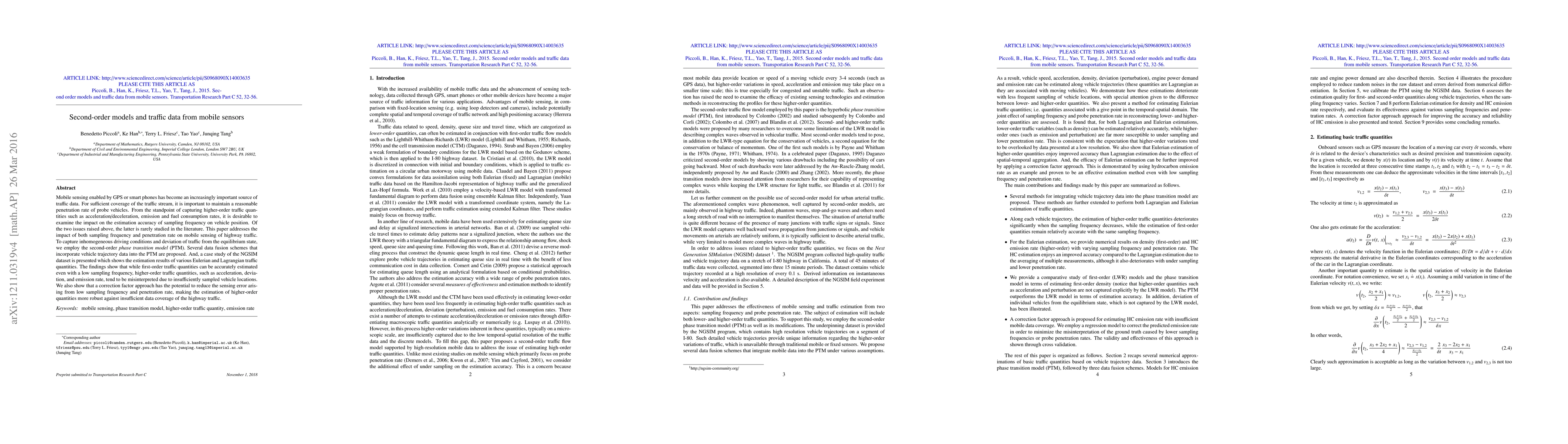 This paper investigates the impact of sampling frequency and probe vehicle penetration rate on mobile sensing data for highway traffic, employing second-order phase transition models. It finds that while first-order traffic metrics can be accurately estimated with low sampling, higher-order metrics like acceleration and emission rates suffer from inaccuracies due to insufficient data, but a correction factor can mitigate these errors.