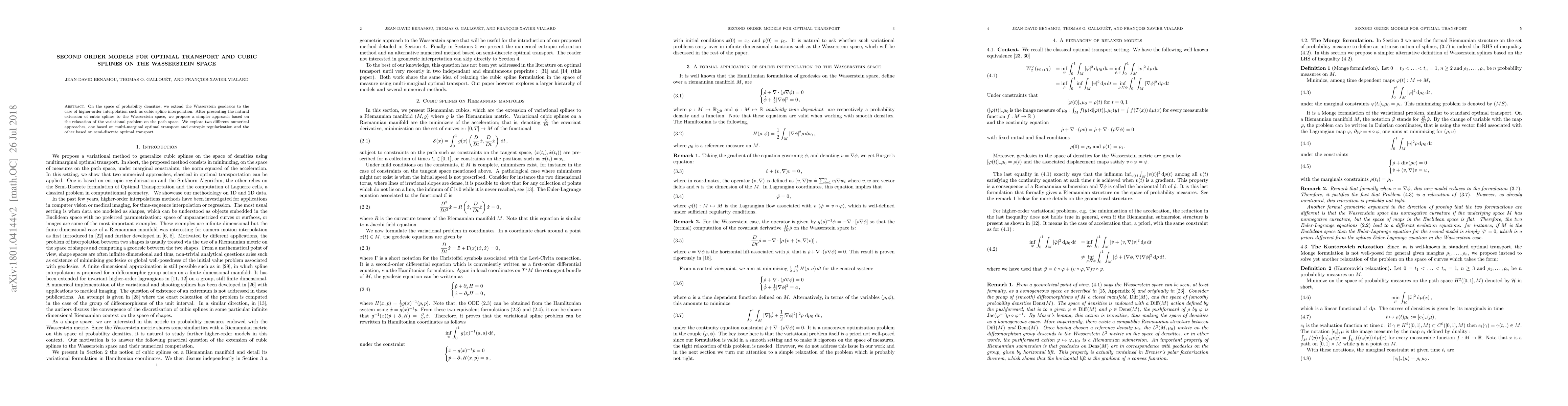 This paper extends Wasserstein geodesics to higher-order interpolation using cubic splines on the Wasserstein space. It proposes a simplified variational relaxation method and explores two numerical approaches for optimal transport: one with multi-marginal optimal transport and entropic regularization, and another using semi-discrete optimal transport.