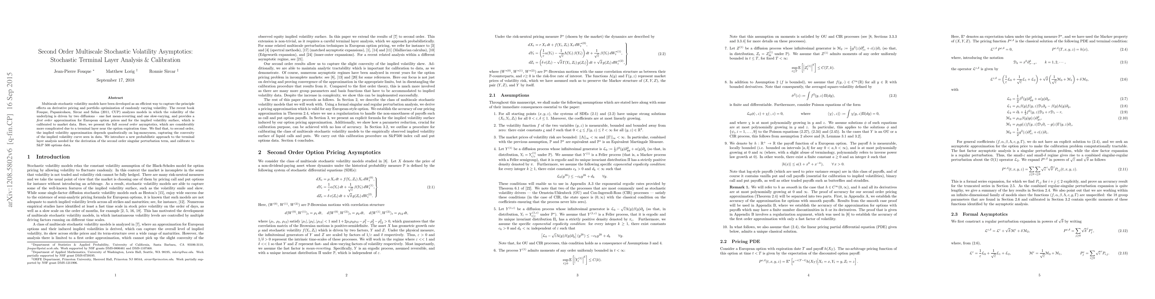 Multiscale stochastic volatility models have been developed as an efficient way to capture the principle effects on derivative pricing and portfolio optimization of randomly varying volatility. The recent book Fouque, Papanicolaou, Sircar and S{\o}lna (2011, CUP) analyzes models in which the volatility of the underlying is driven by two diffusions -- one fast mean-reverting and one slow-varying, and provides a first order approximation for European option prices and for the implied volatility surface, which is calibrated to market data. Here, we present the full second order asymptotics, which are considerably more complicated due to a terminal layer near the option expiration time. We find that, to second order, the implied volatility approximation depends quadratically on log-moneyness, capturing the convexity of the implied volatility curve seen in data. We introduce a new probabilistic approach to the terminal layer analysis needed for the derivation of the second order singular perturbation term, and calibrate to S&P 500 options data.