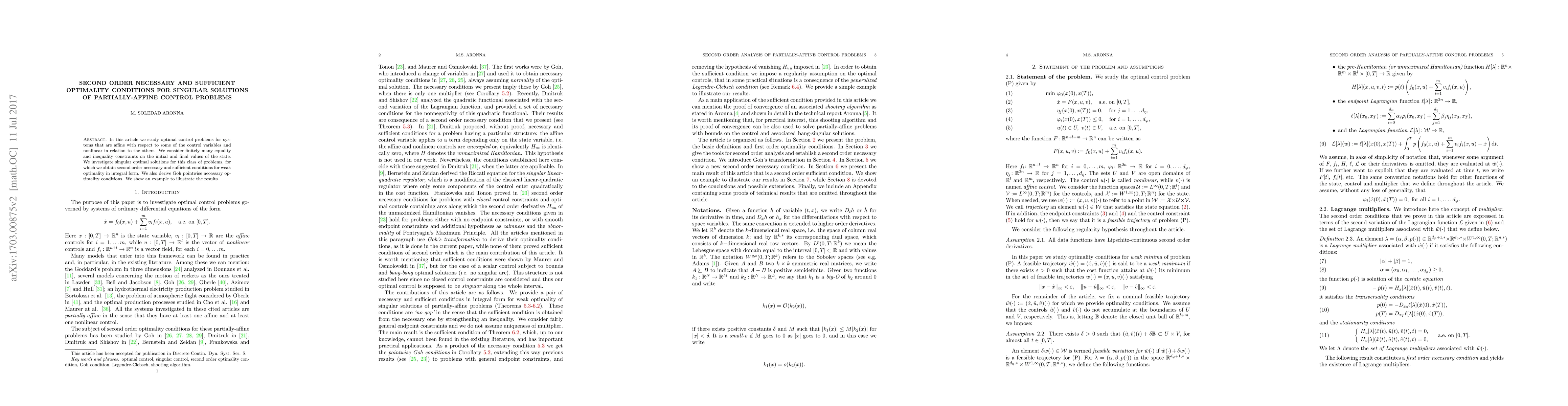 This paper presents second order necessary and sufficient conditions for weak optimality of singular solutions in partially-affine control problems with constraints. It also derives Goh pointwise necessary conditions and provides an example for illustration.