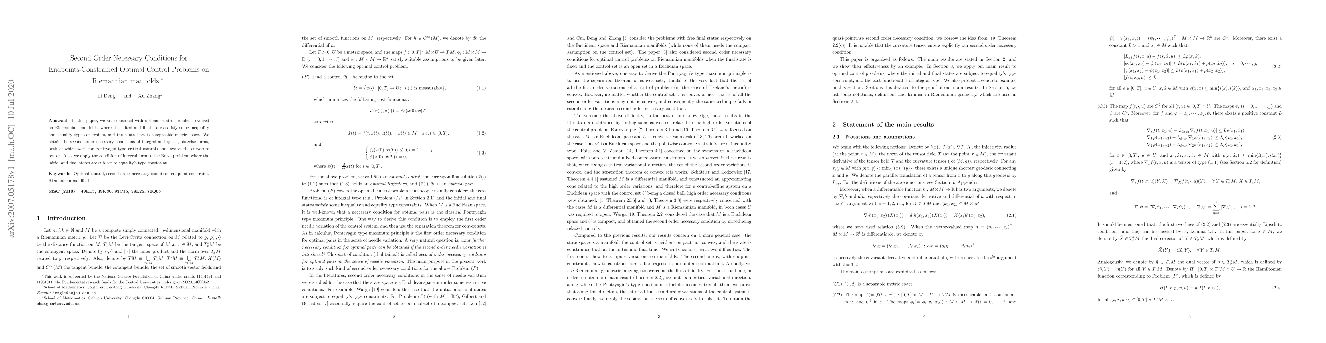 In this paper, we are concerned with optimal control problems evolved on Riemannian manifolds, where the initial and final states satisfy some inequality and equality type constraints, and the control set is a separable metric space. We obtain the second order necessary conditions of integral and quasi-pointwise forms, both of which work for Pontryagin type critical controls and involve the curvature tensor. Also, we apply the condition of integral form to the Bolza problem, where the initial and final states are subject to equality's type constraint.