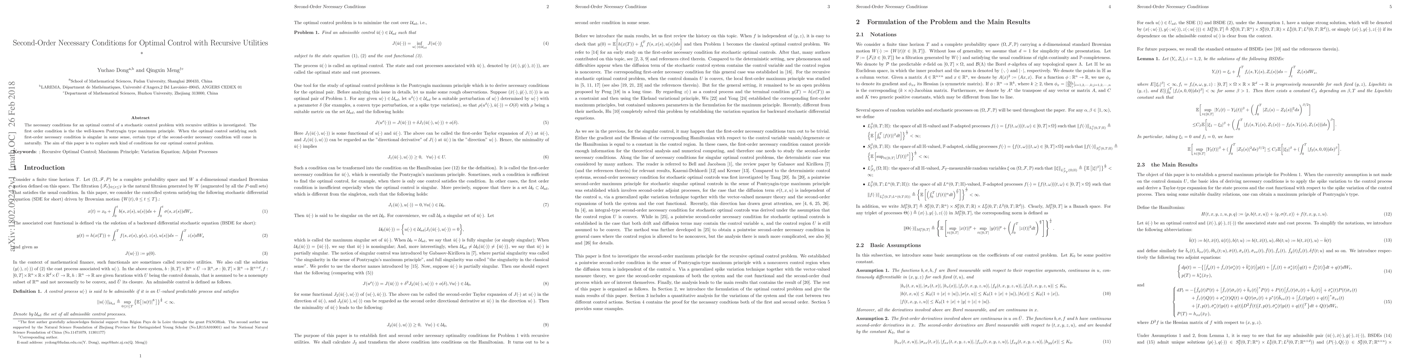 This paper investigates the second-order necessary conditions for optimal control in stochastic control problems with recursive utilities, extending beyond the first-order Pontryagin maximum principle to address cases where the optimal control is singular.
