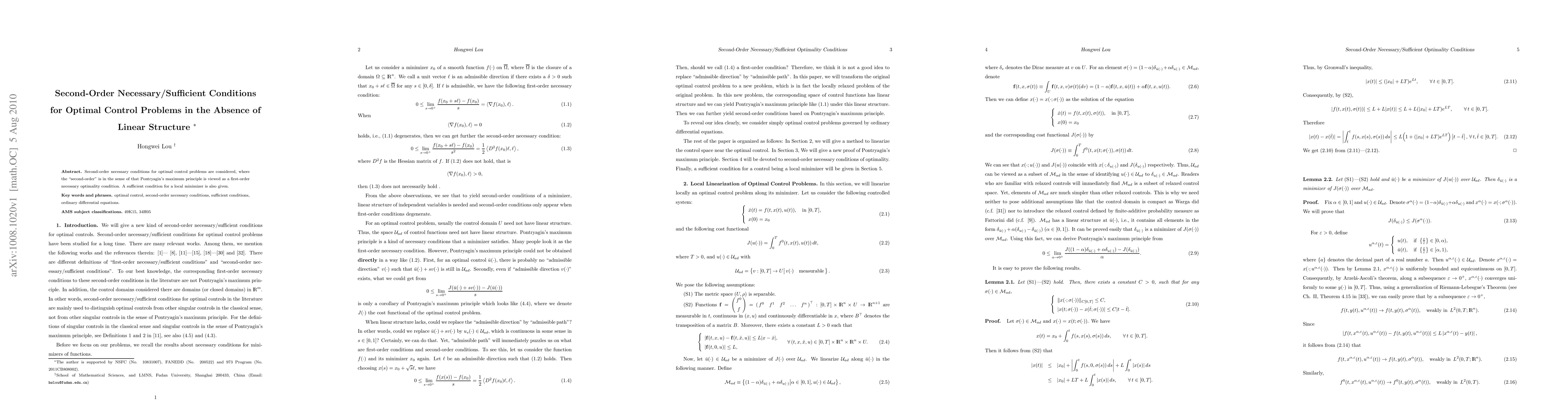 This paper presents second-order necessary conditions for optimal control problems, extending beyond the first-order necessary conditions of Pontryagin's maximum principle. It also provides a sufficient condition for a local minimizer in scenarios lacking linear structure.