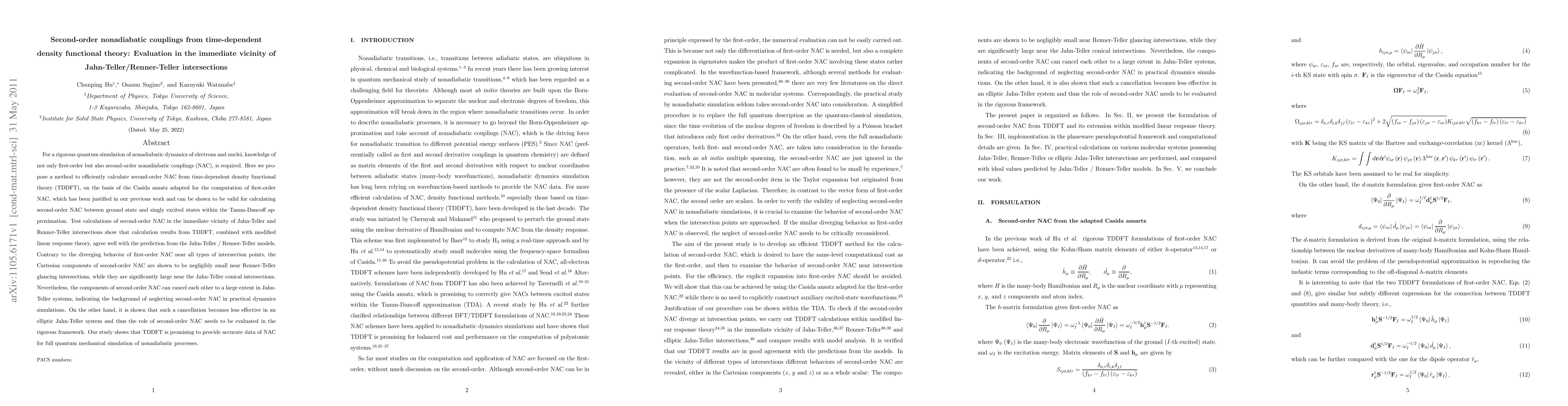 The paper introduces a method to efficiently calculate second-order NAC from TDDFT, adapting the Casida ansatz for first-order NAC calculations, and validates it against Jahn-Teller and Renner-Teller models.