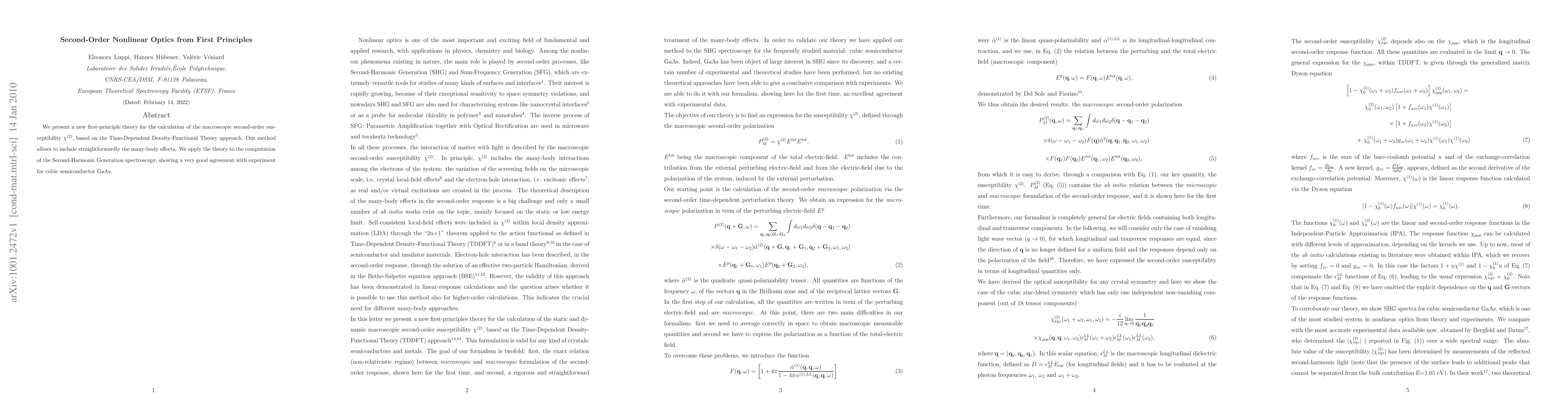 We present a new first-principle theory for the calculation of the macroscopic second-order susceptibility chi^(2), based on the Time-Dependent Density-Functional Theory approach. Our method allows to include straightforwardly the many-body effects. We apply the theory to the computation of the Second-Harmonic Generation spectroscopy, showing a very good agreement with experiment for cubic semiconductor GaAs.