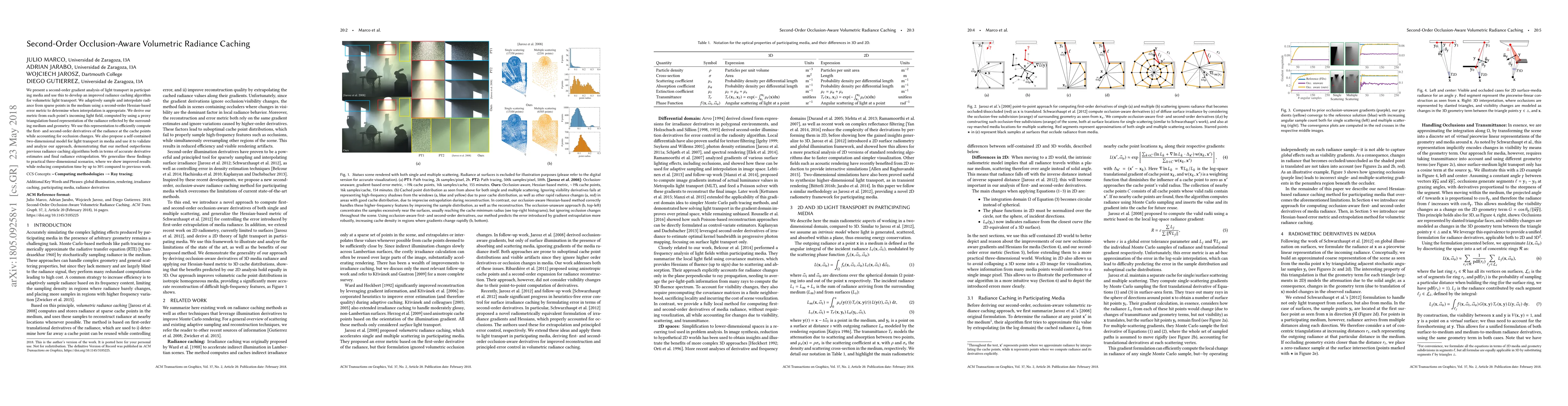 This paper introduces a second-order gradient analysis for light transport in participating media, leading to an advanced radiance caching algorithm. The method adaptively samples and interpolates radiance using a second-order Hessian-based error metric, significantly improving accuracy over previous algorithms and reducing computation time by up to 30%.