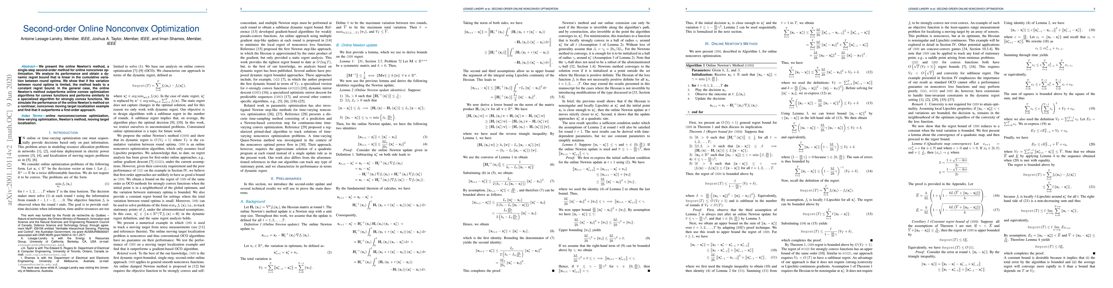 This paper introduces the online Newton's method, a second-order optimization technique for online nonconvex optimization, and demonstrates its performance through a dynamic regret bound. The method shows constant regret when the variation between round optima is limited, and outperforms first-order methods in simulations for a nonlinear, nonconvex localization problem.