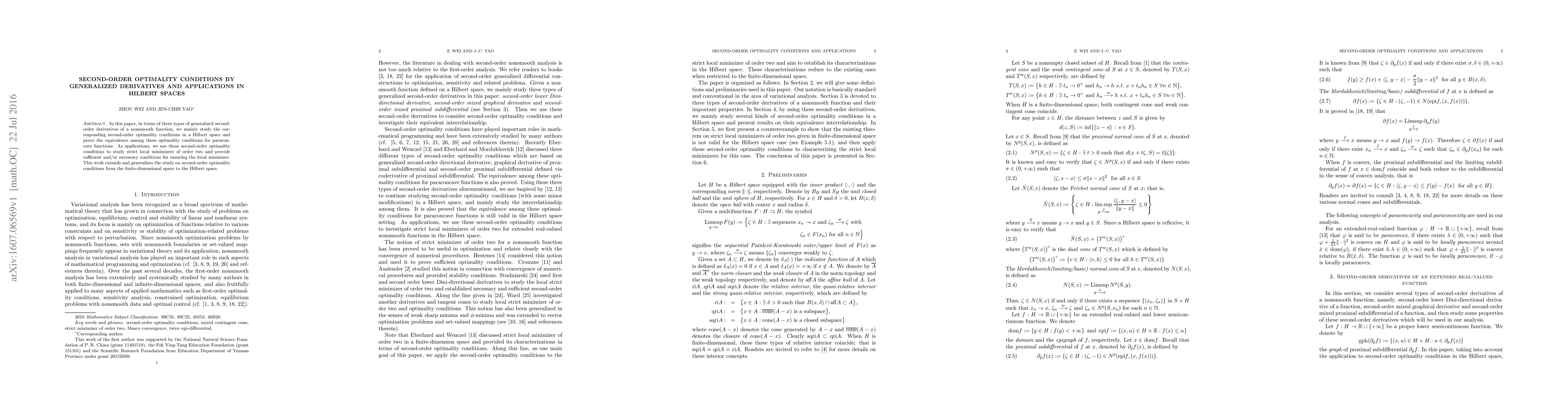 This paper investigates second-order optimality conditions in Hilbert spaces using three types of generalized second-order derivatives, proving their equivalence for paraconcave functions. It also applies these conditions to establish sufficient and necessary criteria for strict local minimizers of order two, extending previous studies from finite-dimensional to infinite-dimensional settings.