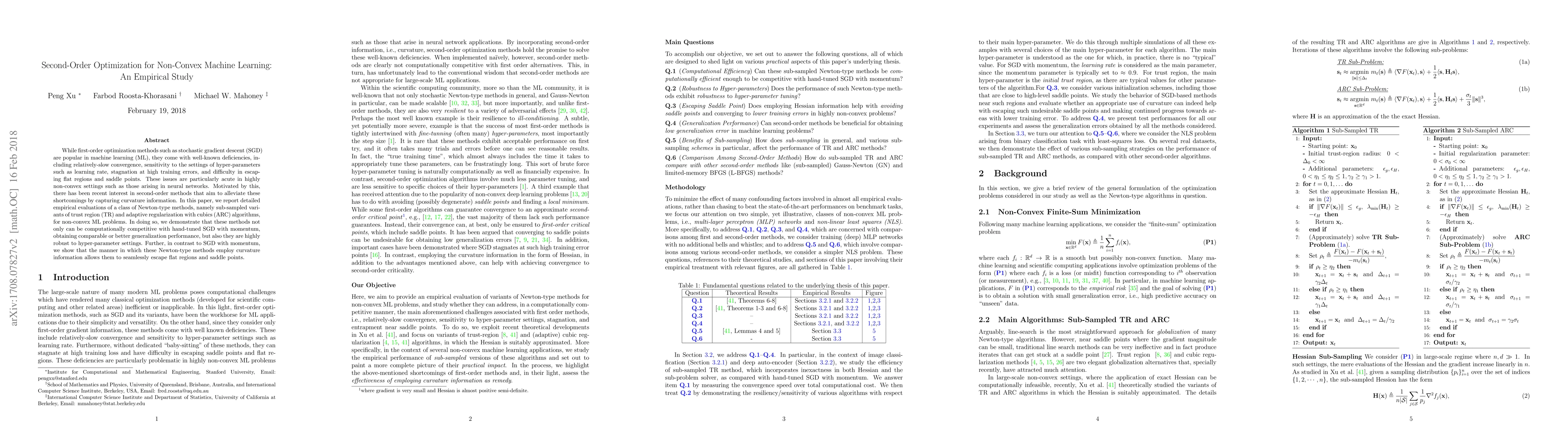 While first-order optimization methods such as stochastic gradient descent (SGD) are popular in machine learning (ML), they come with well-known deficiencies, including relatively-slow convergence, sensitivity to the settings of hyper-parameters such as learning rate, stagnation at high training errors, and difficulty in escaping flat regions and saddle points. These issues are particularly acute in highly non-convex settings such as those arising in neural networks. Motivated by this, there has been recent interest in second-order methods that aim to alleviate these shortcomings by capturing curvature information. In this paper, we report detailed empirical evaluations of a class of Newton-type methods, namely sub-sampled variants of trust region (TR) and adaptive regularization with cubics (ARC) algorithms, for non-convex ML problems. In doing so, we demonstrate that these methods not only can be computationally competitive with hand-tuned SGD with momentum, obtaining comparable or better generalization performance, but also they are highly robust to hyper-parameter settings. Further, in contrast to SGD with momentum, we show that the manner in which these Newton-type methods employ curvature information allows them to seamlessly escape flat regions and saddle points.