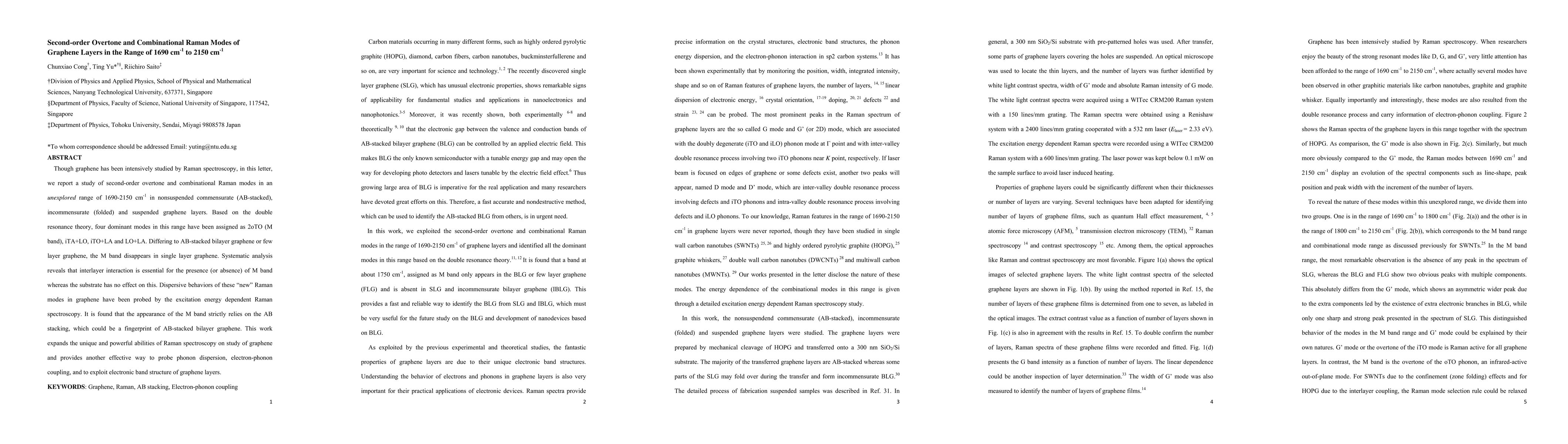Though graphene has been intensively studied by Raman spectroscopy, in this letter, we report a study of second-order overtone and combinational Raman modes in an unexplored range of 1690-2150 cm-1 in nonsuspended commensurate (AB-stacked), incommensurate (folded) and suspended graphene layers. Based on the double resonance theory, four dominant modes in this range have been assigned as 2oTO (M band), iTA+LO, iTO+LA and LO+LA. Differing to AB-stacked bilayer graphene or few layer graphene, the M band disappears in single layer graphene. Systematic analysis reveals that interlayer interaction is essential for the presence (or absence) of M band whereas the substrate has no effect on this. Dispersive behaviors of these "new" Raman modes in graphene have been probed by the excitation energy dependent Raman spectroscopy. It is found that the appearance of the M band strictly relies on the AB stacking, which could be a fingerprint of AB-stacked bilayer graphene. This work expands the unique and powerful abilities of Raman spectroscopy on study of graphene and provides another effective way to probe phonon dispersion, electron-phonon coupling, and to exploit electronic band structure of graphene layers.