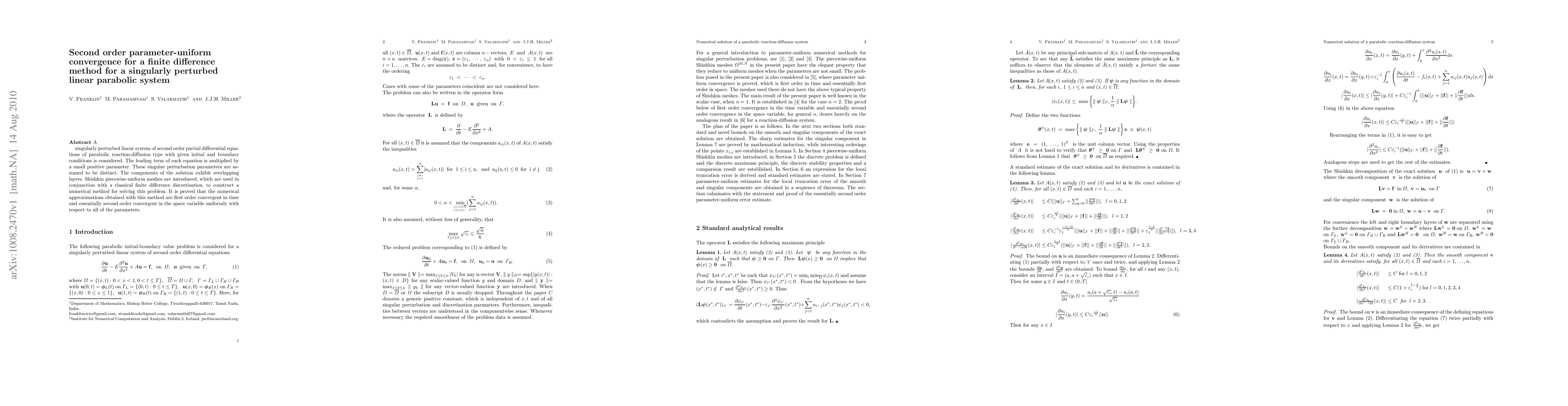 This paper investigates a finite difference method for solving a singularly perturbed linear parabolic system, demonstrating first order time convergence and second order parameter-uniform space convergence using Shishkin meshes. The method effectively handles the solution's overlapping layers.