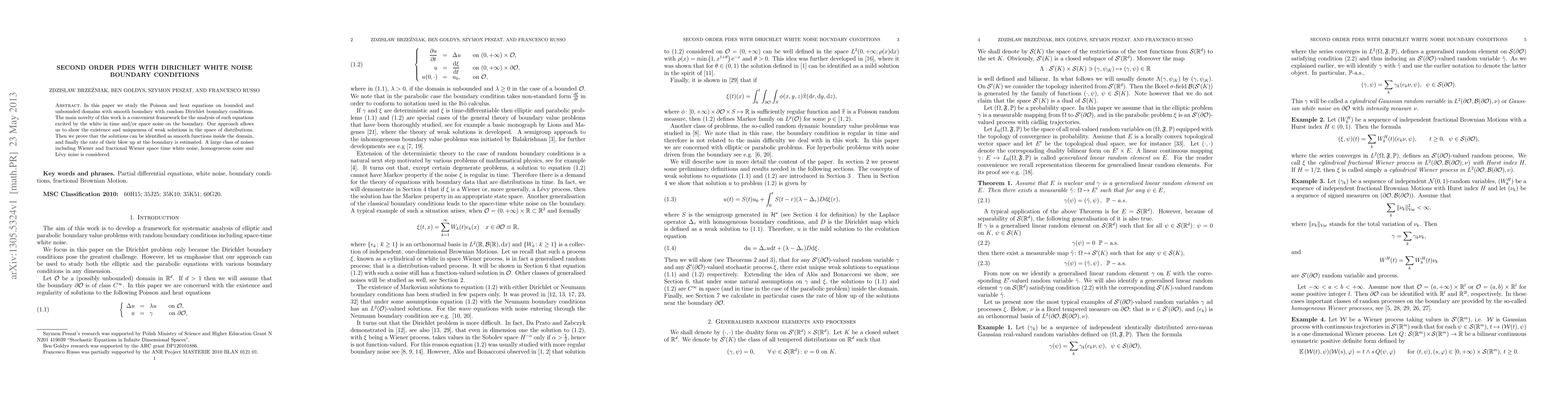 In this paper we study the Poisson and heat equations on bounded and unbounded domains with smooth boundary with random Dirichlet boundary conditions. The main novelty of this work is a convenient framework for the analysis of such equations excited by the white in time and/or space noise on the boundary. Our approach allows us to show the existence and uniqueness of weak solutions in the space of distributions. Then we prove that the solutions can be identified as smooth functions inside the domain, and finally the rate of their blow up at the boundary is estimated. A large class of noises including Wiener and fractional Wiener space time white noise, homogeneous noise and L\'evy noise is considered.