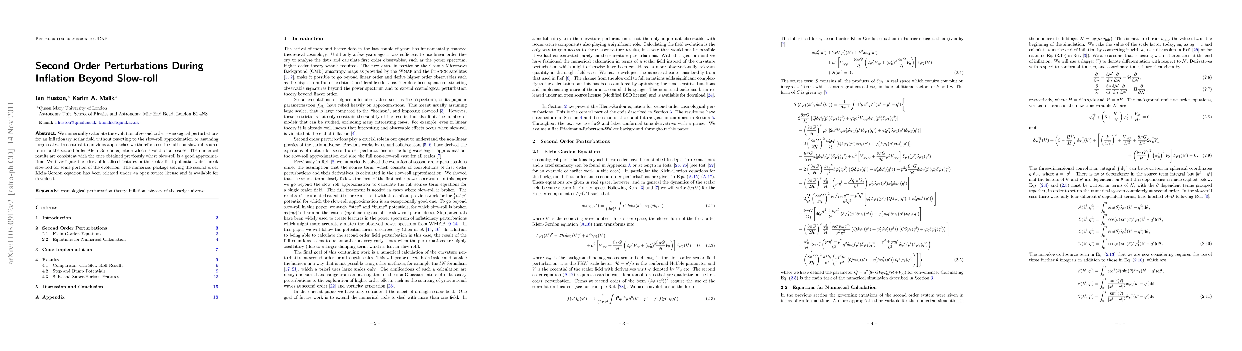 We numerically calculate the evolution of second order cosmological perturbations for an inflationary scalar field without resorting to the slow-roll approximation or assuming large scales. In contrast to previous approaches we therefore use the full non-slow-roll source term for the second order Klein-Gordon equation which is valid on all scales. The numerical results are consistent with the ones obtained previously where slow-roll is a good approximation. We investigate the effect of localised features in the scalar field potential which break slow-roll for some portion of the evolution. The numerical package solving the second order Klein-Gordon equation has been released under an open source license and is available for download.