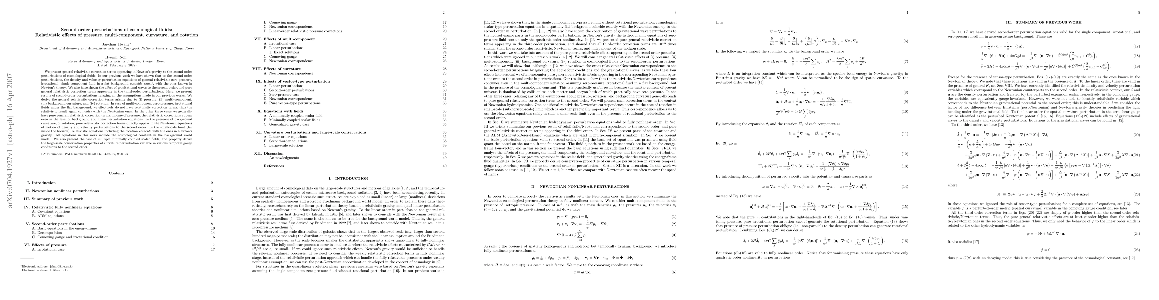 This paper investigates general relativistic corrections to second-order perturbations in cosmological fluids, focusing on effects from pressure, multi-component fluids, background curvature, and rotation. While relativistic corrections do not appear in multi-component zero-pressure fluids, they significantly alter density and velocity perturbation equations in the presence of pressure, curvature, or rotation.