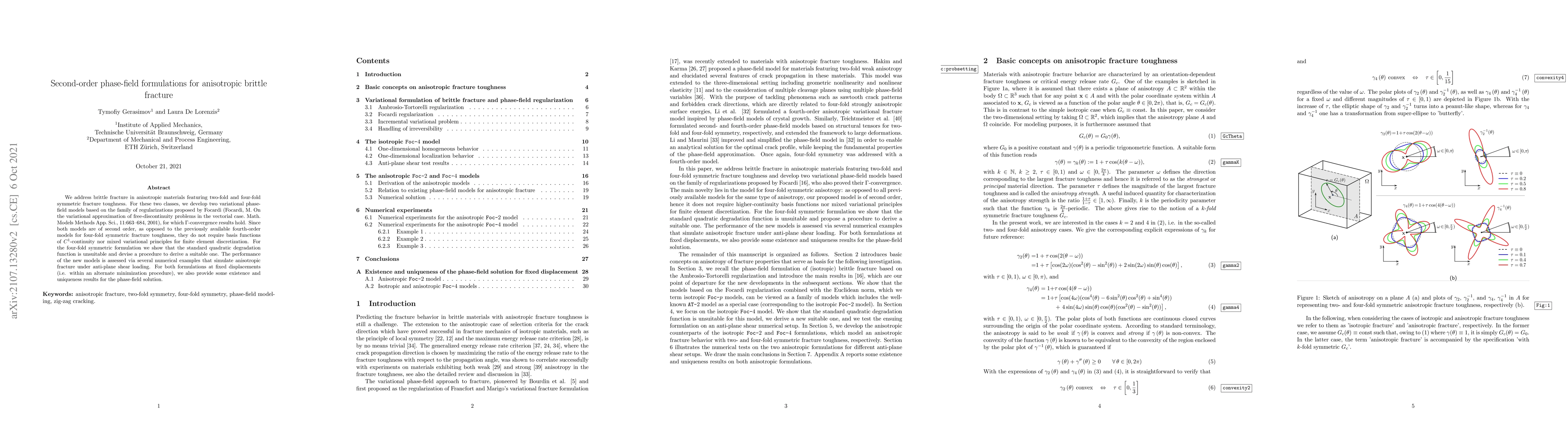 We address brittle fracture in anisotropic materials featuring two-fold and four-fold symmetric fracture toughness. For these two classes, we develop two variational phase-field models based on the family of regularizations proposed by Focardi (Focardi, M. On the variational approximation of free-discontinuity problems in the vectorial case. Math. Models Methods App. Sci., 11:663{684, 2001), for which Gamma-convergence results hold. Since both models are of second order, as opposed to the previously available fourth-order models for four-fold symmetric fracture toughness, they do not require basis functions of C1-continuity nor mixed variational principles for finite element discretization. For the four-fold symmetric formulation we show that the standard quadratic degradation function is unsuitable and devise a procedure to derive a suitable one. The performance of the new models is assessed via several numerical examples that simulate anisotropic fracture under anti-plane shear loading. For both formulations at fixed displacements (i.e. within an alternate minimization procedure), we also provide some existence and uniqueness results for the phase-field solution.