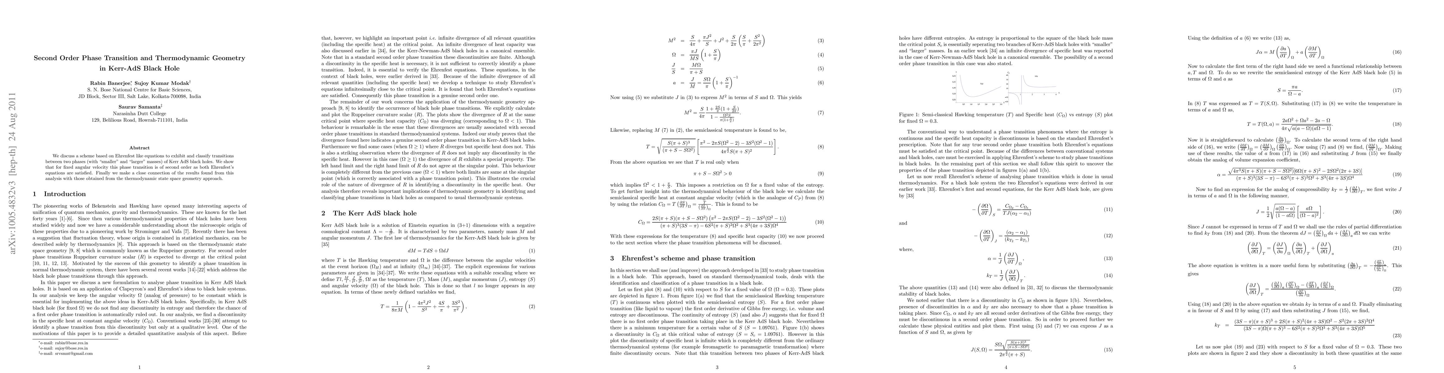 We discuss a scheme based on Ehrenfest like equations to exhibit and classify transitions between two phases (with "smaller" and "larger" masses) of Kerr AdS black holes. We show that for fixed angular velocity this phase transition is of second order as both Ehrenfest's equations are satisfied. Finally we make a close connection of the results found from this analysis with those obtained from the thermodynamic state space geometry approach.