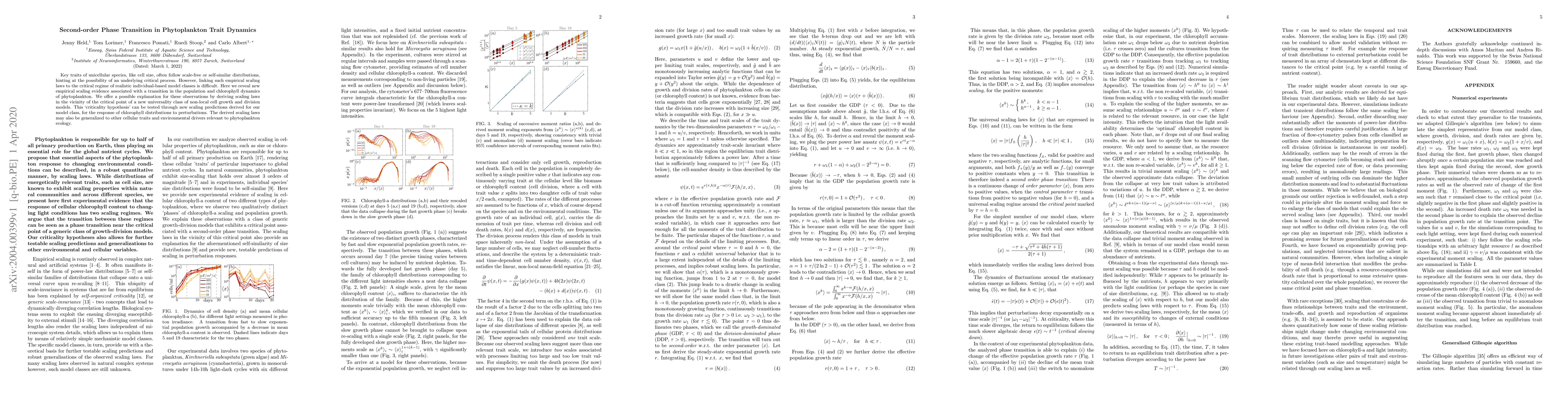 Key traits of unicellular species, like cell size, often follow scale-free or self-similar distributions, hinting at the possibility of an underlying critical process. However, linking such empirical scaling laws to the critical regime of realistic individual-based model classes is difficult. Here we reveal new empirical scaling evidence associated with a transition in the population and chlorophyll dynamics of phytoplankton. We offer a possible explanation for these observations by deriving scaling laws in the vicinity of the critical point of a new universality class of non-local cell growth and division models. This `criticality hypothesis' can be tested through new scaling predictions derived for our model class, for the response of chlorophyll distributions to perturbations. The derived scaling laws may also be generalized to other cellular traits and environmental drivers relevant to phytoplankton ecology.