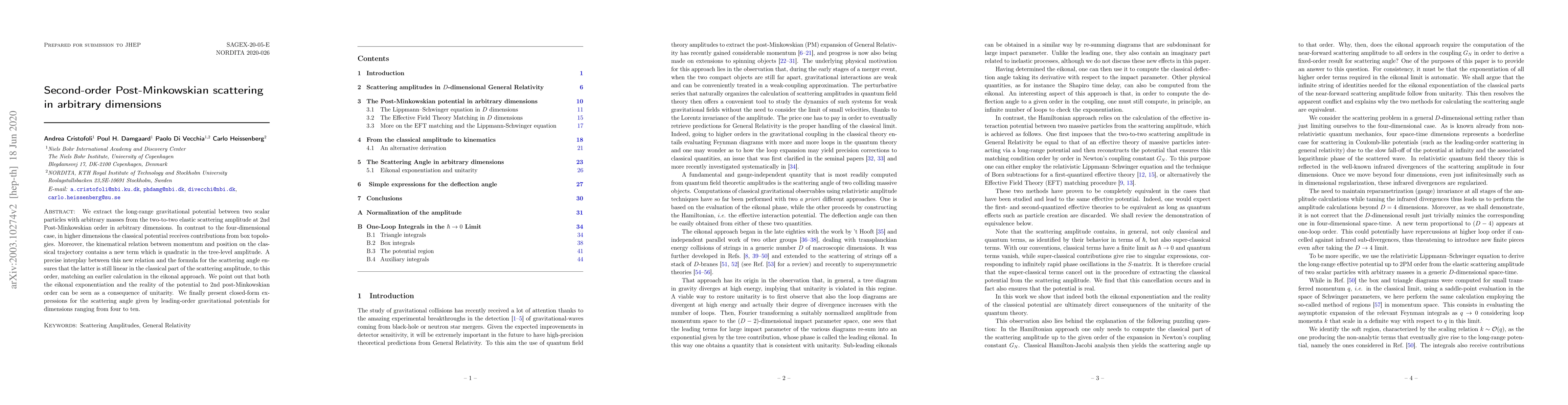 This paper investigates the long-range gravitational potential between two scalar particles at the second Post-Minkowskian order in arbitrary dimensions, revealing new contributions from box topologies and a quadratic term in the kinematical relation. It concludes with closed-form expressions for the scattering angle in dimensions from four to ten.