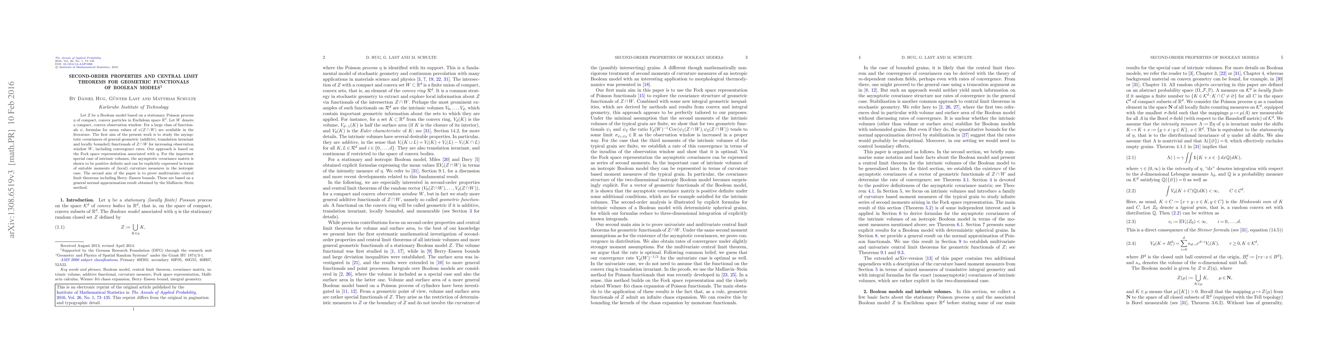 This paper investigates geometric functionals of a Boolean model with Poisson process particles, focusing on asymptotic covariances and central limit theorems for increasing observation windows.