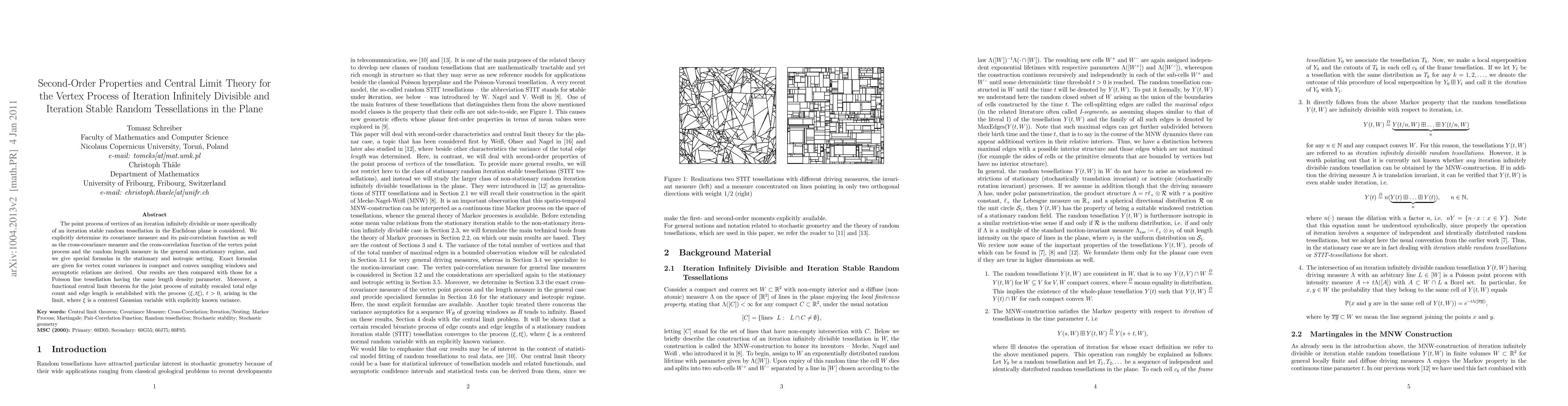 This paper investigates the vertex point process of iteration stable random tessellation in the plane, determining its covariance measures and correlation functions, and deriving vertex count variances. It also establishes a functional central limit theorem for the rescaled total edge count and edge length, comparing it to a Poisson line tessellation.