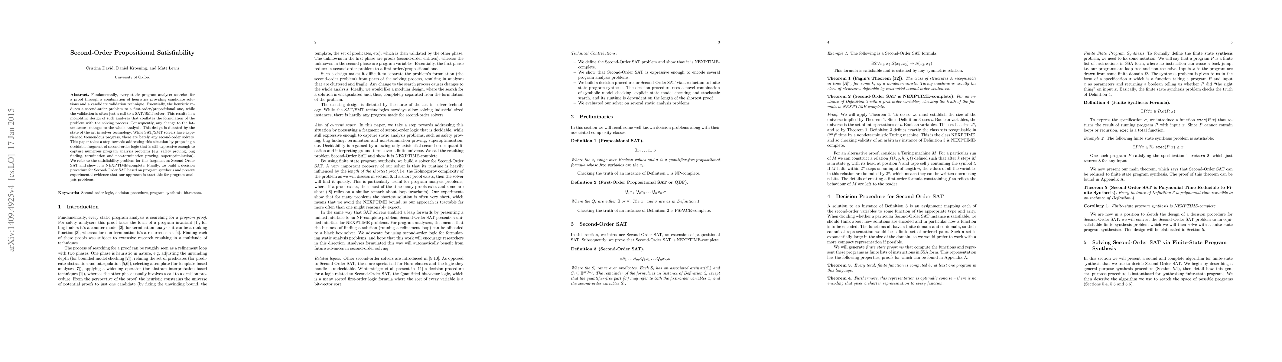 Fundamentally, every static program analyser searches for a proof through a combination of heuristics providing candidate solutions and a candidate validation technique. Essentially, the heuristic reduces a second-order problem to a first-order/propositional one, while the validation is often just a call to a SAT/SMT solver. This results in a monolithic design of such analyses that conflates the formulation of the problem with the solving process. Consequently, any change to the latter causes changes to the whole analysis. This design is dictated by the state of the art in solver technology. While SAT/SMT solvers have experienced tremendous progress, there are barely any second-order solvers. This paper takes a step towards addressing this situation by proposing a decidable fragment of second-order logic that is still expressive enough to capture numerous program analysis problems (e.g. safety proving, bug finding, termination and non-termination proving, superoptimisation). We refer to the satisfiability problem for this fragment as Second-Order SAT and show it is NEXPTIME-complete. Finally, we build a decision procedure for Second-Order SAT based on program synthesis and present experimental evidence that our approach is tractable for program analysis problems.