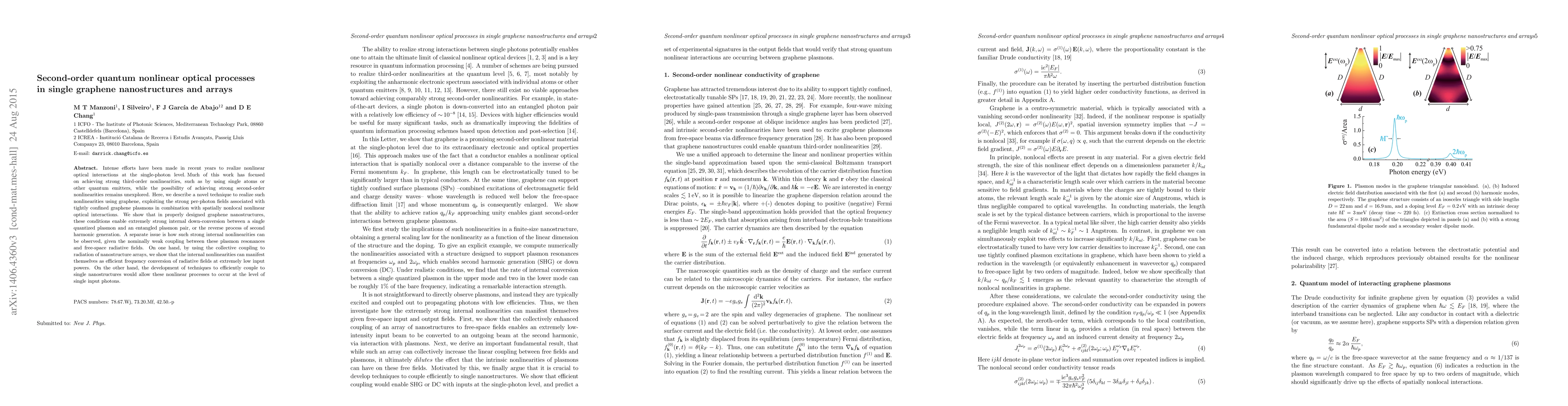 Intense efforts have been made in recent years to realize nonlinear optical interactions at the single-photon level. Much of this work has focused on achieving strong third-order nonlinearities, such as by using single atoms or other quantum emitters while the possibility of achieving strong second-order nonlinearities remains unexplored. Here, we describe a novel technique to realize such nonlinearities using graphene, exploiting the strong per-photon fields associated with tightly confined graphene plasmons in combination with spatially nonlocal nonlinear optical interactions. We show that in properly designed graphene nanostructures, these conditions enable extremely strong internal down-conversion between a single quantized plasmon and an entangled plasmon pair, or the reverse process of second harmonic generation. A separate issue is how such strong internal nonlinearities can be observed, given the nominally weak coupling between these plasmon resonances and free-space radiative fields. On one hand, by using the collective coupling to radiation of nanostructure arrays, we show that the internal nonlinearities can manifest themselves as efficient frequency conversion of radiative fields at extremely low input powers. On the other hand, the development of techniques to efficiently couple to single nanostructures would allow these nonlinear processes to occur at the level of single input photons.