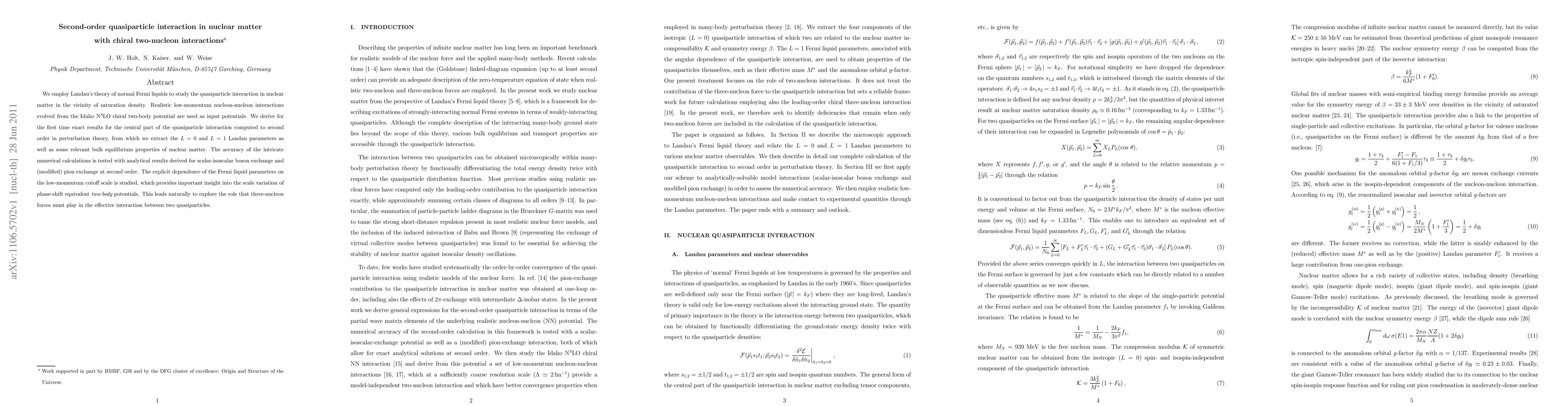 This paper uses Landau's theory to investigate quasiparticle interactions in nuclear matter near saturation density, employing chiral two-nucleon interactions. It derives exact results for the central quasiparticle interaction to second order, extracting Landau parameters and equilibrium properties, and discusses the influence of three-nucleon forces.