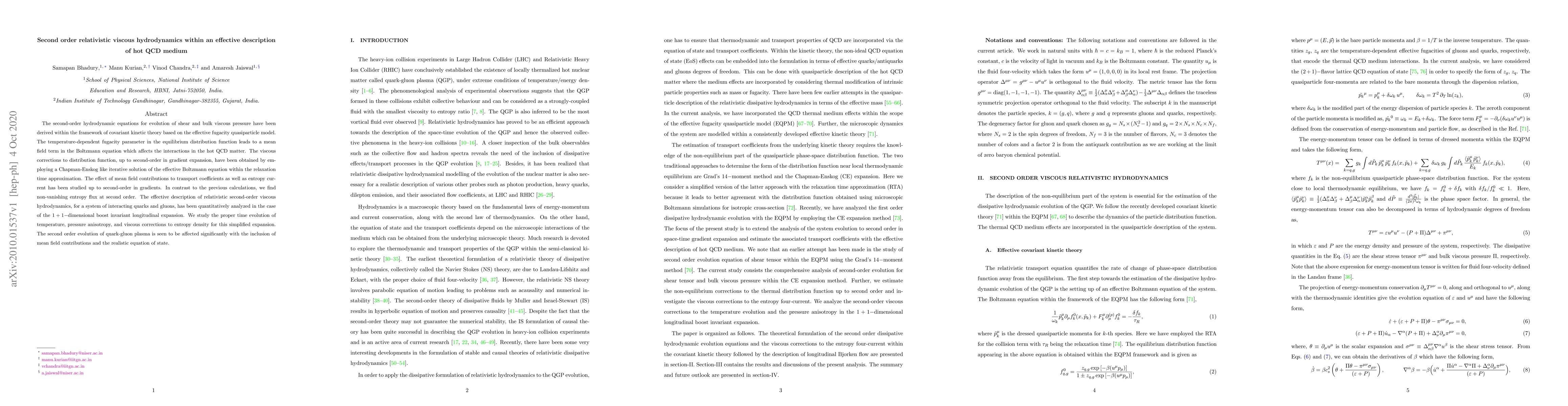 This paper derives second-order relativistic hydrodynamic equations for shear and bulk viscosity within a covariant kinetic theory framework, focusing on the effective fugacity quasiparticle model for hot QCD medium. It finds non-vanishing entropy flux at second-order and analyzes the impact of mean field contributions on the evolution of temperature, pressure anisotropy, and entropy density in a simplified boost invariant expansion.