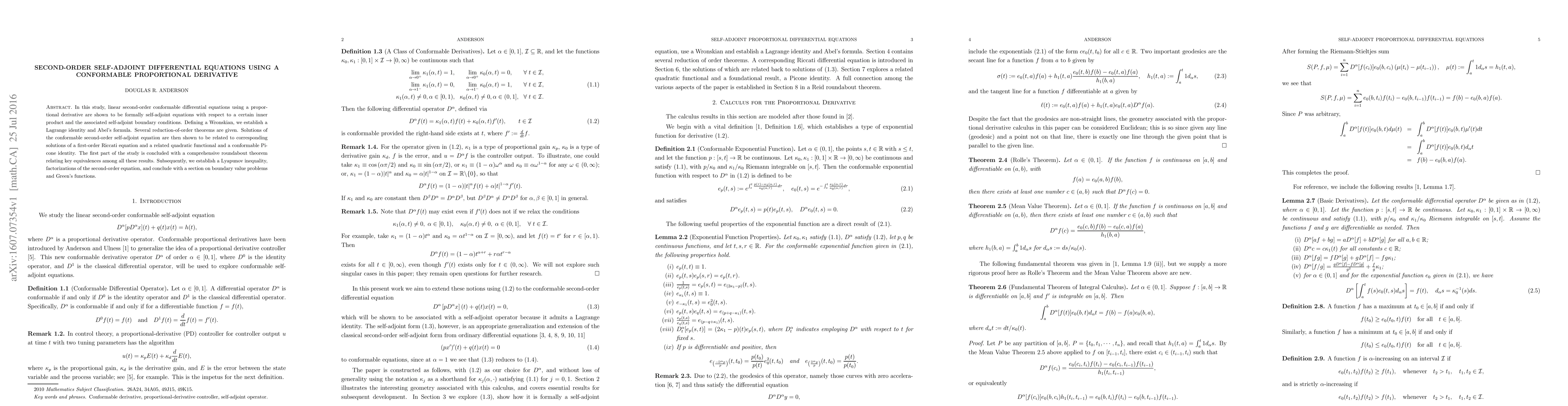 In this study, linear second-order conformable differential equations using a proportional derivative are shown to be formally self-adjoint equations with respect to a certain inner product and the associated self-adjoint boundary conditions. Defining a Wronskian, we establish a Lagrange identity and Abel's formula. Several reduction-of-order theorems are given. Solutions of the conformable second-order self-adjoint equation are then shown to be related to corresponding solutions of a first-order Riccati equation and a related quadratic functional and a conformable Picone identity. The first part of the study is concluded with a comprehensive roundabout theorem relating key equivalences among all these results. Subsequently, we establish a Lyapunov inequality, factorizations of the second-order equation, and conclude with a section on boundary value problems and Green's functions.