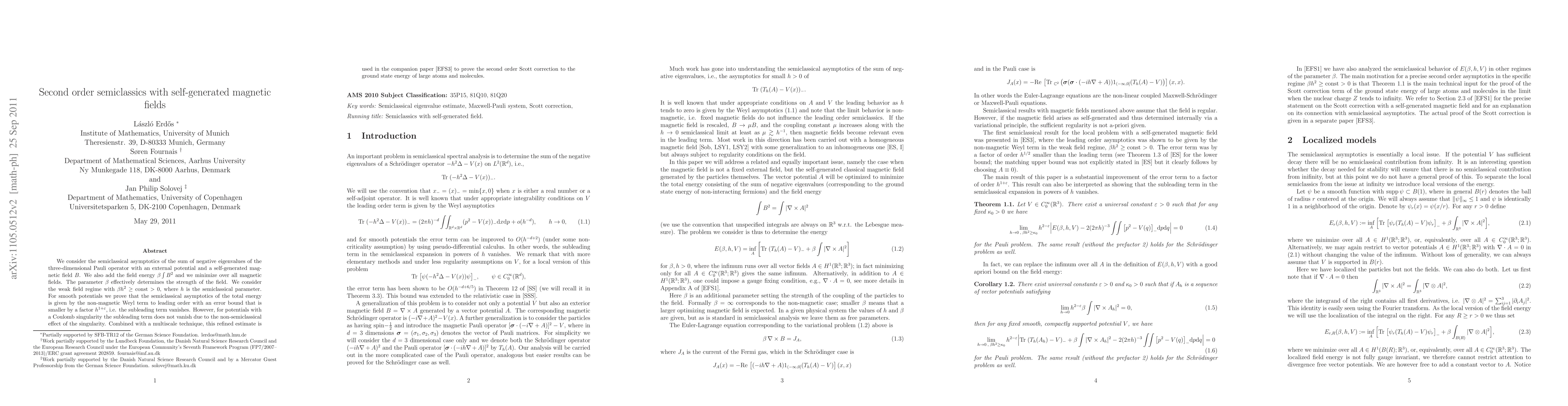 We consider the semiclassical asymptotics of the sum of negative eigenvalues of the three-dimensional Pauli operator with an external potential and a self-generated magnetic field $B$. We also add the field energy $\beta \int B^2$ and we minimize over all magnetic fields. The parameter $\beta$ effectively determines the strength of the field. We consider the weak field regime with $\beta h^{2}\ge {const}>0$, where $h$ is the semiclassical parameter. For smooth potentials we prove that the semiclassical asymptotics of the total energy is given by the non-magnetic Weyl term to leading order with an error bound that is smaller by a factor $h^{1+\e}$, i.e. the subleading term vanishes. However, for potentials with a Coulomb singularity the subleading term does not vanish due to the non-semiclassical effect of the singularity. Combined with a multiscale technique, this refined estimate is used in the companion paper \cite{EFS3} to prove the second order Scott correction to the ground state energy of large atoms and molecules.
