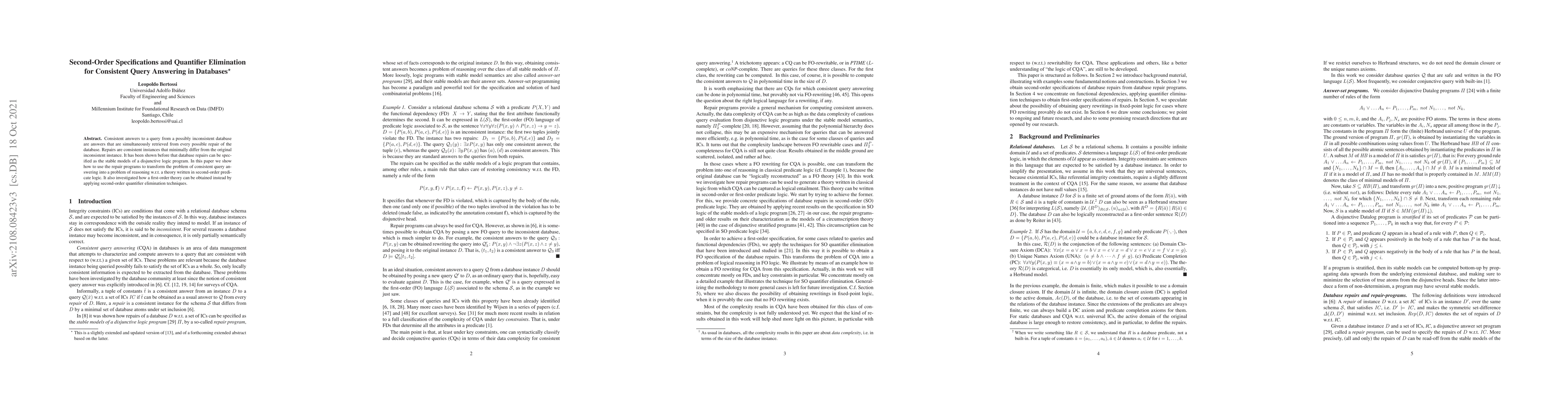 Consistent answers to a query from a possibly inconsistent database are answers that are simultaneously retrieved from every possible repair of the database. Repairs are consistent instances that minimally differ from the original inconsistent instance. It has been shown before that database repairs can be specified as the stable models of a disjunctive logic program. In this paper we show how to use the repair programs to transform the problem of consistent query answering into a problem of reasoning w.r.t. a theory written in second-order predicate logic. It also investigated how a first-order theory can be obtained instead by applying second-order quantifier elimination techniques.
