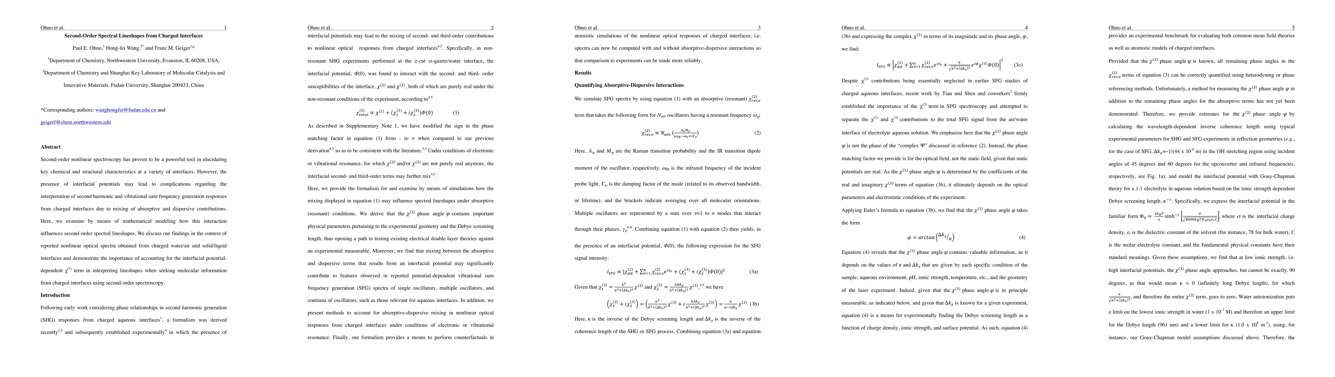 Second-order nonlinear spectroscopy has proven to be a powerful tool in elucidating key chemical and structural characteristics at a variety of interfaces. However, the presence of interfacial potentials may lead to complications regarding the interpretation of second harmonic and vibrational sum frequency generation responses from charged interfaces due to mixing of absorptive and dispersive contributions. Here, we examine by means of mathematical modeling how this interaction influences second-order spectral lineshapes. We discuss our findings in the context of reported nonlinear optical spectra obtained from charged water/air and solid/liquid interfaces and demonstrate the importance of accounting for the interfacial potential-dependent \c{hi}(3) term in interpreting lineshapes when seeking molecular information from charged interfaces using second-order spectroscopy.