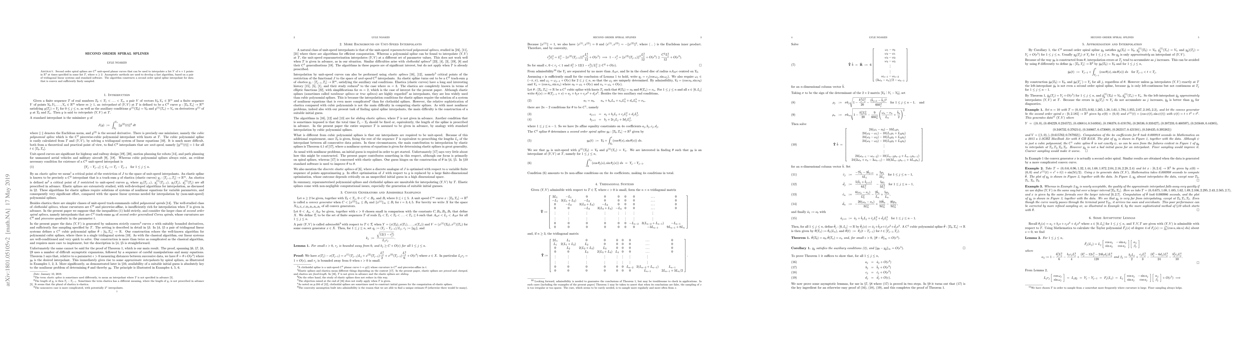 Second order spiral splines are $C^2$ unit-speed planar curves that can be used to interpolate a list $Y$ of $n+1$ points in $\R ^2$ at times specified in some list $T$, where $n\geq 2$. Asymptotic methods are used to develop a fast algorithm, based on a pair of tridiagonal linear systems and standard software. The algorithm constructs a second order spiral spline interpolant for data that is convex and sufficiently finely sampled.