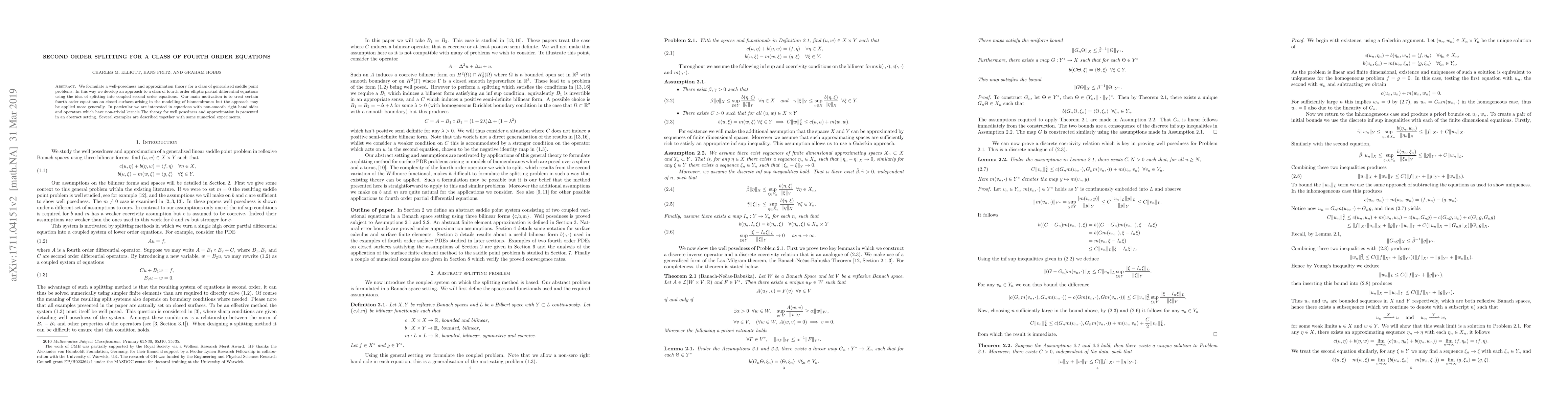 We formulate a well-posedness and approximation theory for a class of generalised saddle point problems. In this way we develop an approach to a class of fourth order elliptic partial differential equations using the idea of splitting into coupled second order equations. Our main motivation is to treat certain fourth order surface equations arising in the modelling of biomembranes but the approach may be applied more generally. In particular, we are interested in equations with non-smooth right hand sides and operators which have non-trivial kernels.The theory for well posedness and approximation is presented in an abstract setting. Several examples are described together with some numerical experiments.