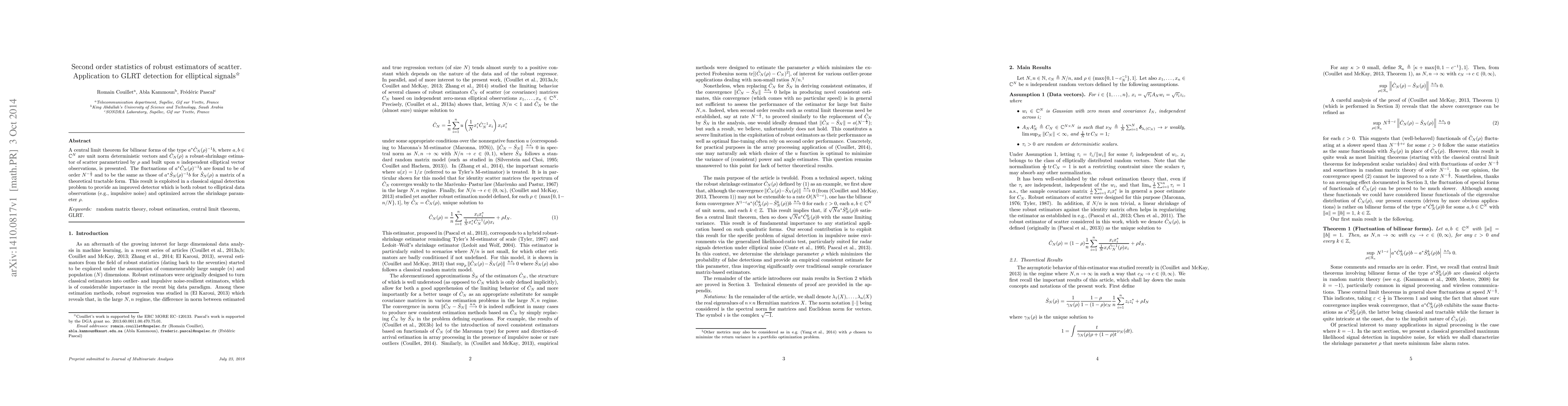 A central limit theorem for bilinear forms of the type $a^*\hat{C}_N(\rho)^{-1}b$, where $a,b\in{\mathbb C}^N$ are unit norm deterministic vectors and $\hat{C}_N(\rho)$ a robust-shrinkage estimator of scatter parametrized by $\rho$ and built upon $n$ independent elliptical vector observations, is presented. The fluctuations of $a^*\hat{C}_N(\rho)^{-1}b$ are found to be of order $N^{-\frac12}$ and to be the same as those of $a^*\hat{S}_N(\rho)^{-1}b$ for $\hat{S}_N(\rho)$ a matrix of a theoretical tractable form. This result is exploited in a classical signal detection problem to provide an improved detector which is both robust to elliptical data observations (e.g., impulsive noise) and optimized across the shrinkage parameter $\rho$.
