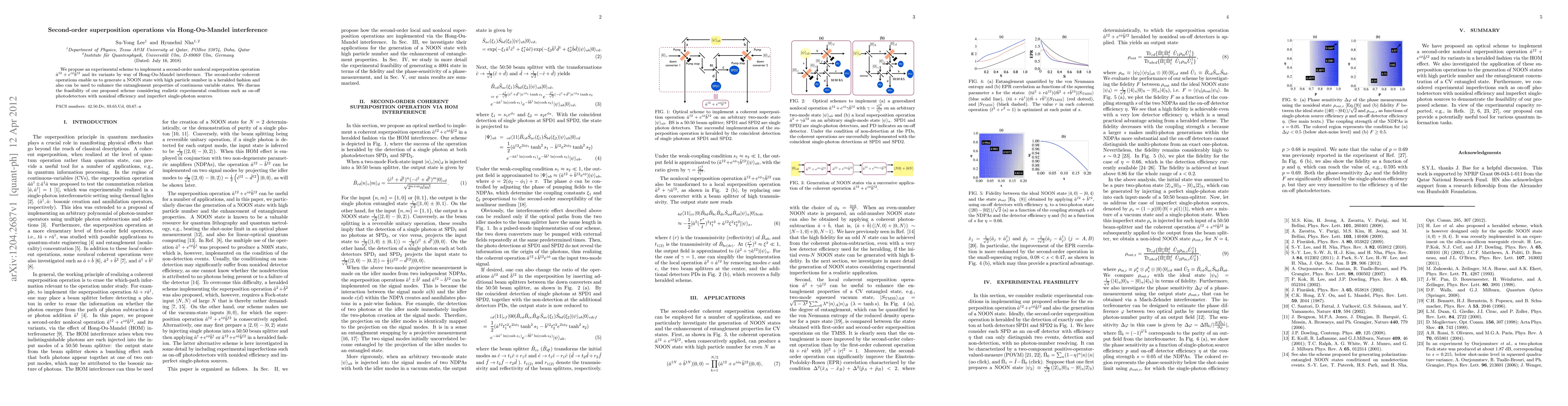 We propose an experimental scheme to implement a second-order nonlocal superposition operation and its variants by way of Hong-Ou-Mandel interference. The second-order coherent operations enable us to generate a NOON state with high particle number in a heralded fashion and also can be used to enhance the entanglement properties of continuous variable states. We discuss the feasibility of our proposed scheme considering realistic experimental conditions such as on-off photodetectors with nonideal efficiency and imperfect single-photon sources.