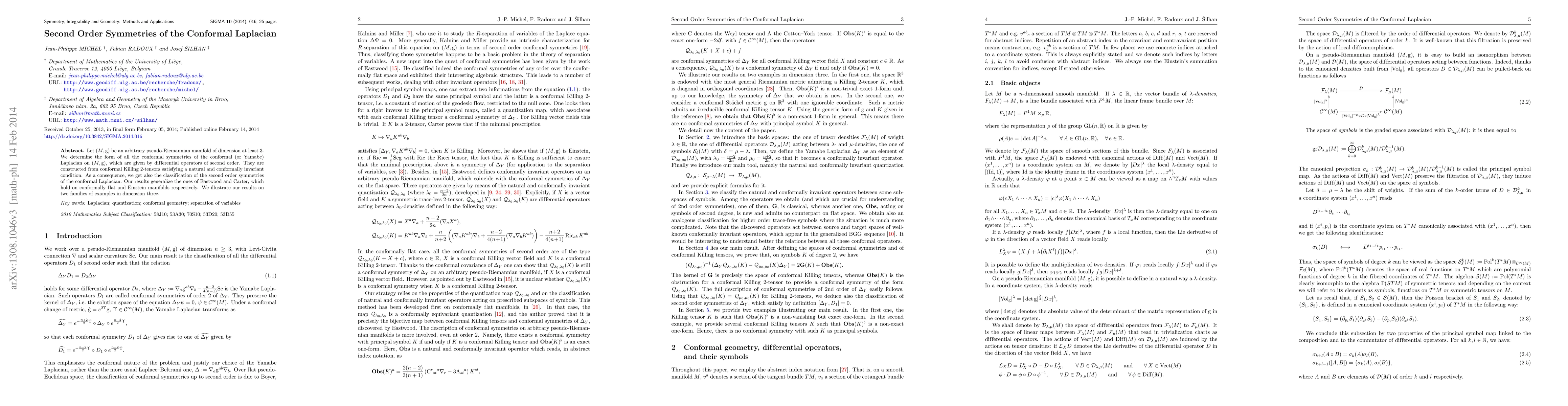 This paper identifies and classifies second-order conformal symmetries of the conformal Laplacian on pseudo-Riemannian manifolds, constructed from conformal Killing 2-tensors. It generalizes previous work by Eastwood and Carter, and provides examples in three dimensions.